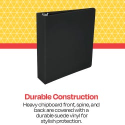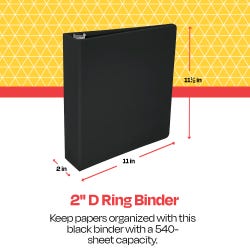 Compile your papers, notes, records, and other essential paperwork inside the School Smart black 2 inch D ring binder. Our binder design has a heavy-gauge chipboard front, back, and spine with a durable suede vinyl cover for extra protection and style. The D ring mechanisms are D-shaped and easy to open and close, so you can store and organize important sheets of paper in your 3 ring binder. Made of polypropylene, the sturdy binder also has two deep inner pockets to hold loose sheets of paper. Our D ring file has a 475 sheet capacity, and the entire black binder measures 11 x 11-1/2 inches.Features