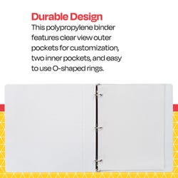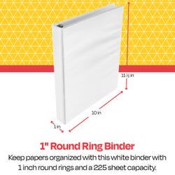 Gather records, paperwork, notes, and other essential papers with the School Smart white 1 inch round ring view binder. Our durable O ring binder with view pockets has a useful non-glare overlay on the front, back, and spine covers to allow you to insert custom labels or individual sheets for easy viewability and access. Cover pockets on the clear view binder also prevent the transfer of ink from printed materials. The O ring mechanisms are O-shaped and easy to open and close, so you can organize and store important sheets of paper in your 3 ring view binder. Made of polypropylene, the sturdy binder also has two deep inner pockets to hold loose sheets of paper. This O ring file has a 225 sheet capacity, and the entire white binder measures 10 x 11-1/2 inches.Features