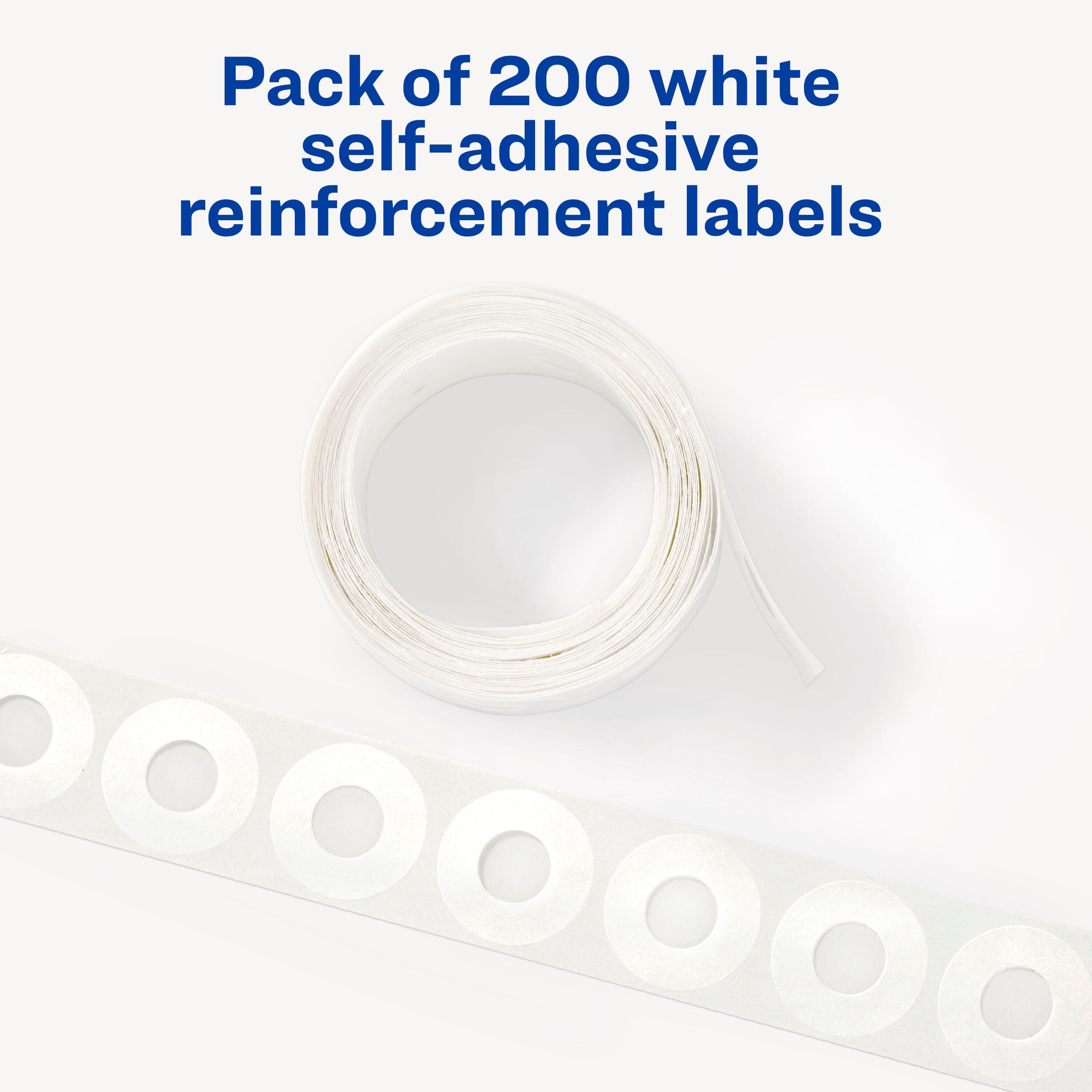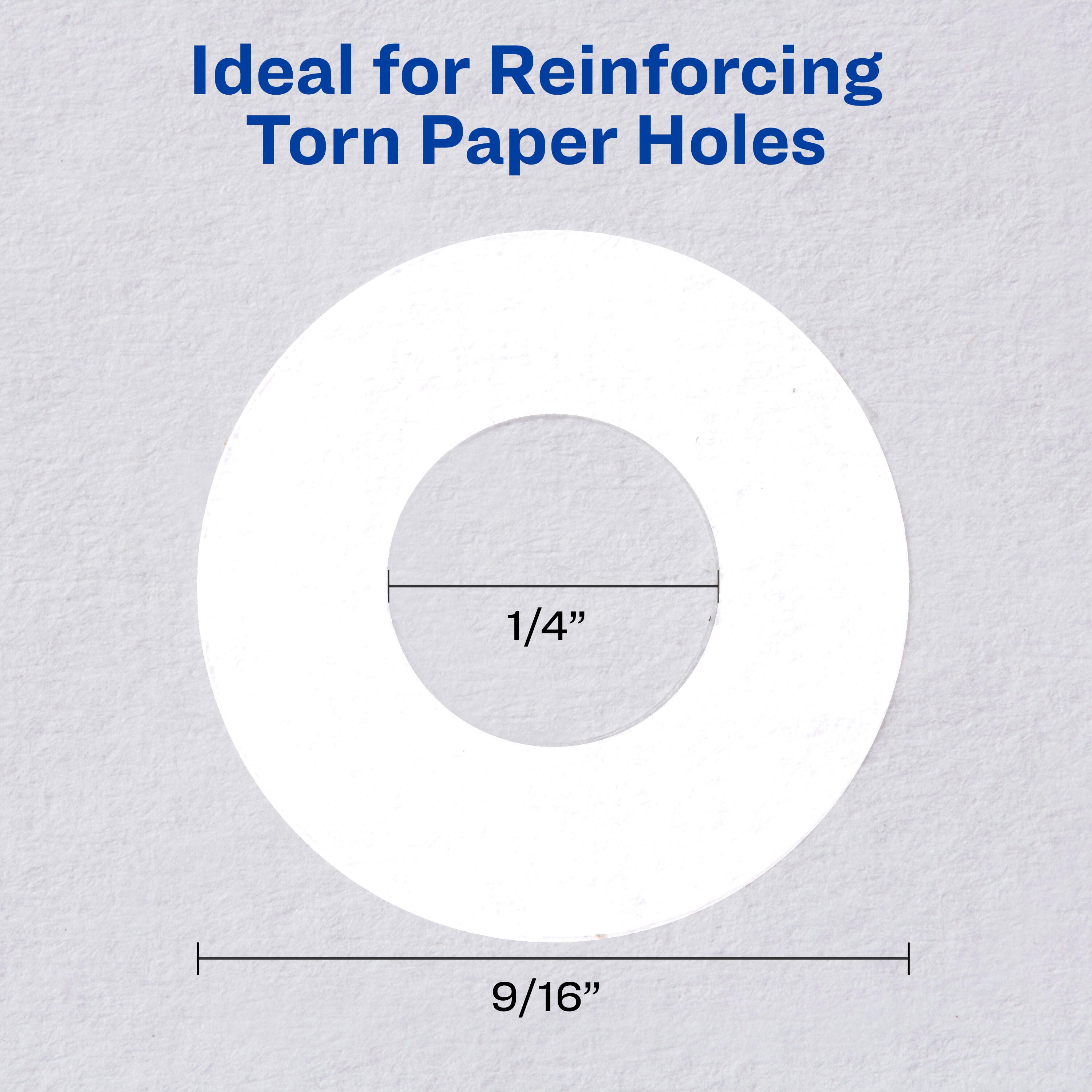 Super-thin, reinforcement label rings are ideal for reinforcing or repairing punched holes in binder paper. Self-adhesive white rings reinforce without covering up information. Handy dispenser peels each self-adhesive reinforcement off the roll, one by one. Adhesive is permanent. Apply the reinforcements to your standard-size, punched holes to provide a durable border that resists tearing. Reinforcement labels offer 1/4 inch diameter holes.