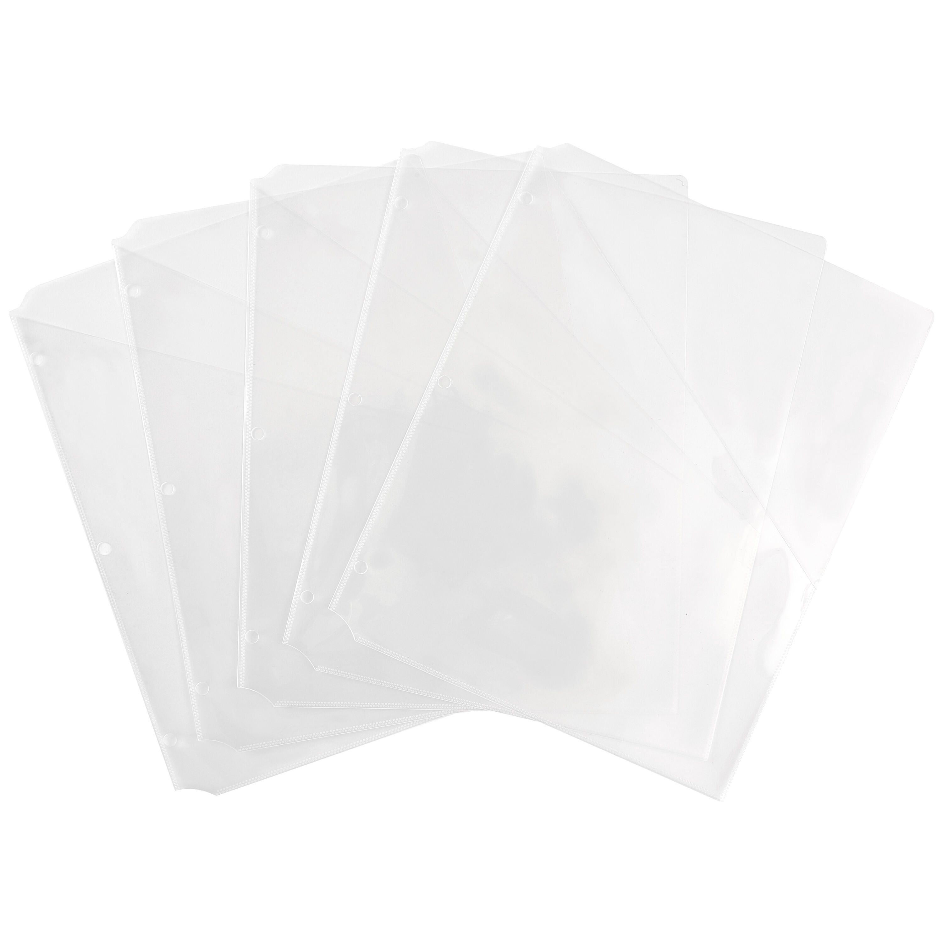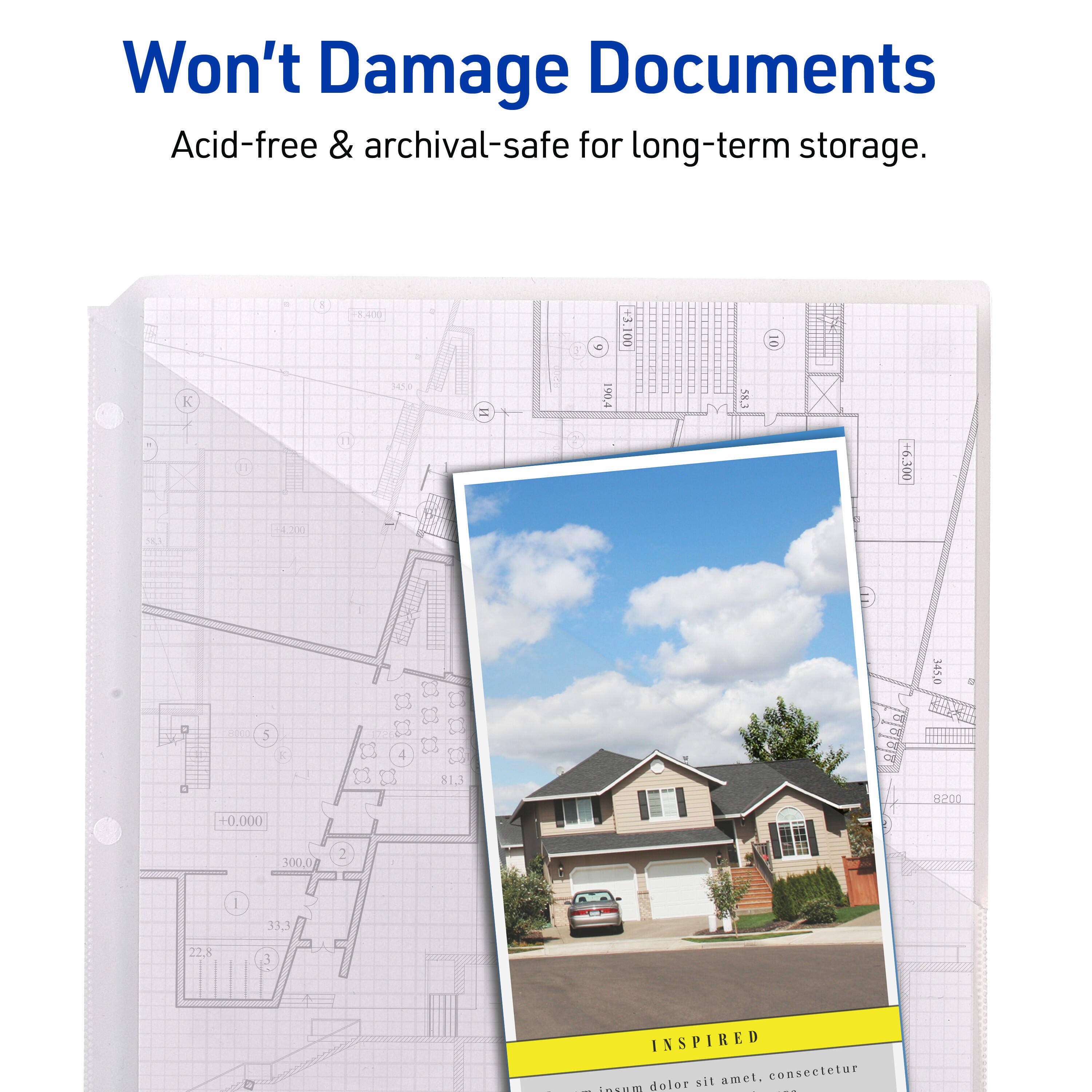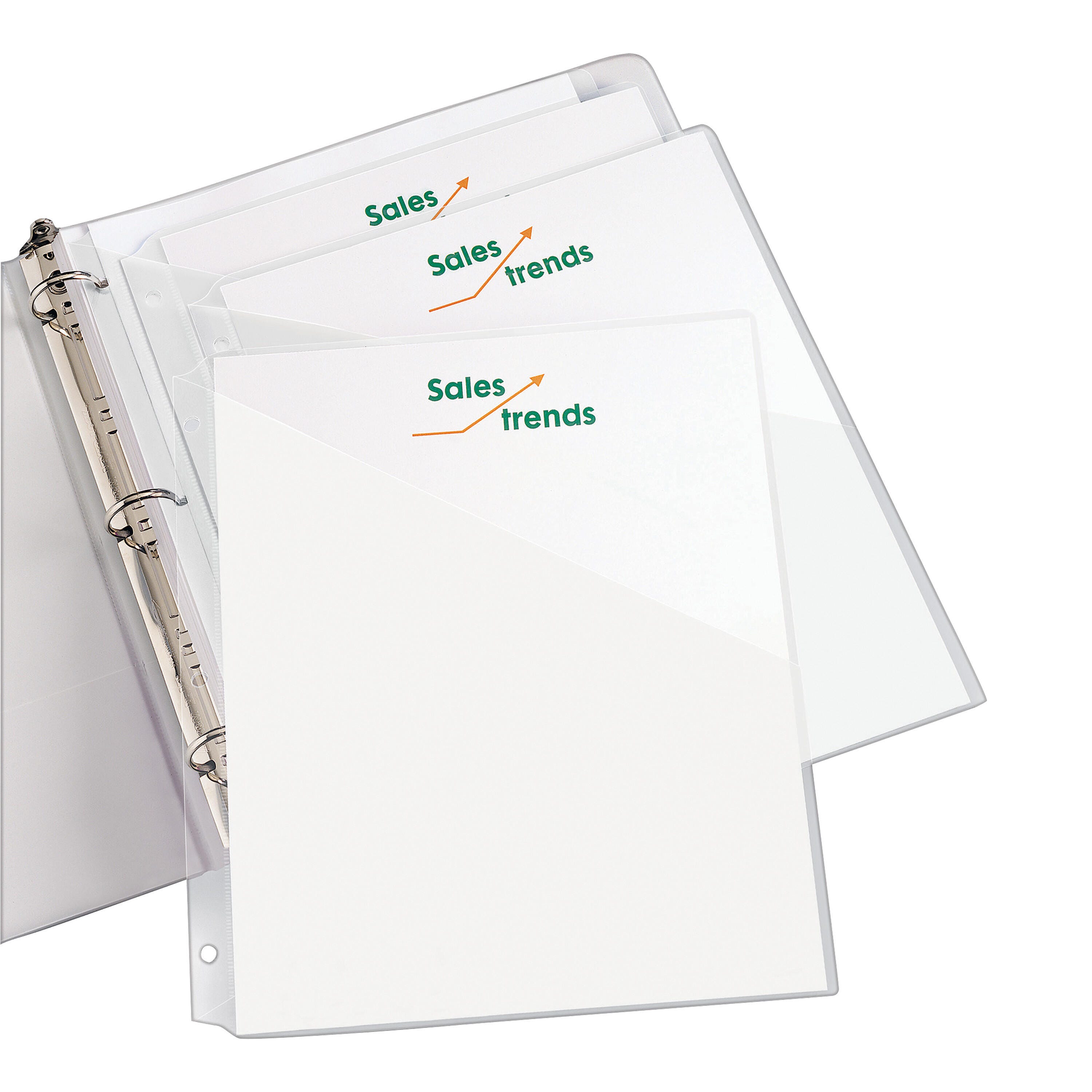 Avery Clear Poly Binder Pocket measuring 8-1/2 x 11 inches holds up to 20 sheets of letter-size paper in ring binders without punching or folding. Pocket perfect for handouts in presentation binders is made from PVC free construction ideal for long-term storage and that will not lift the print. It is sold in a pack of 5.