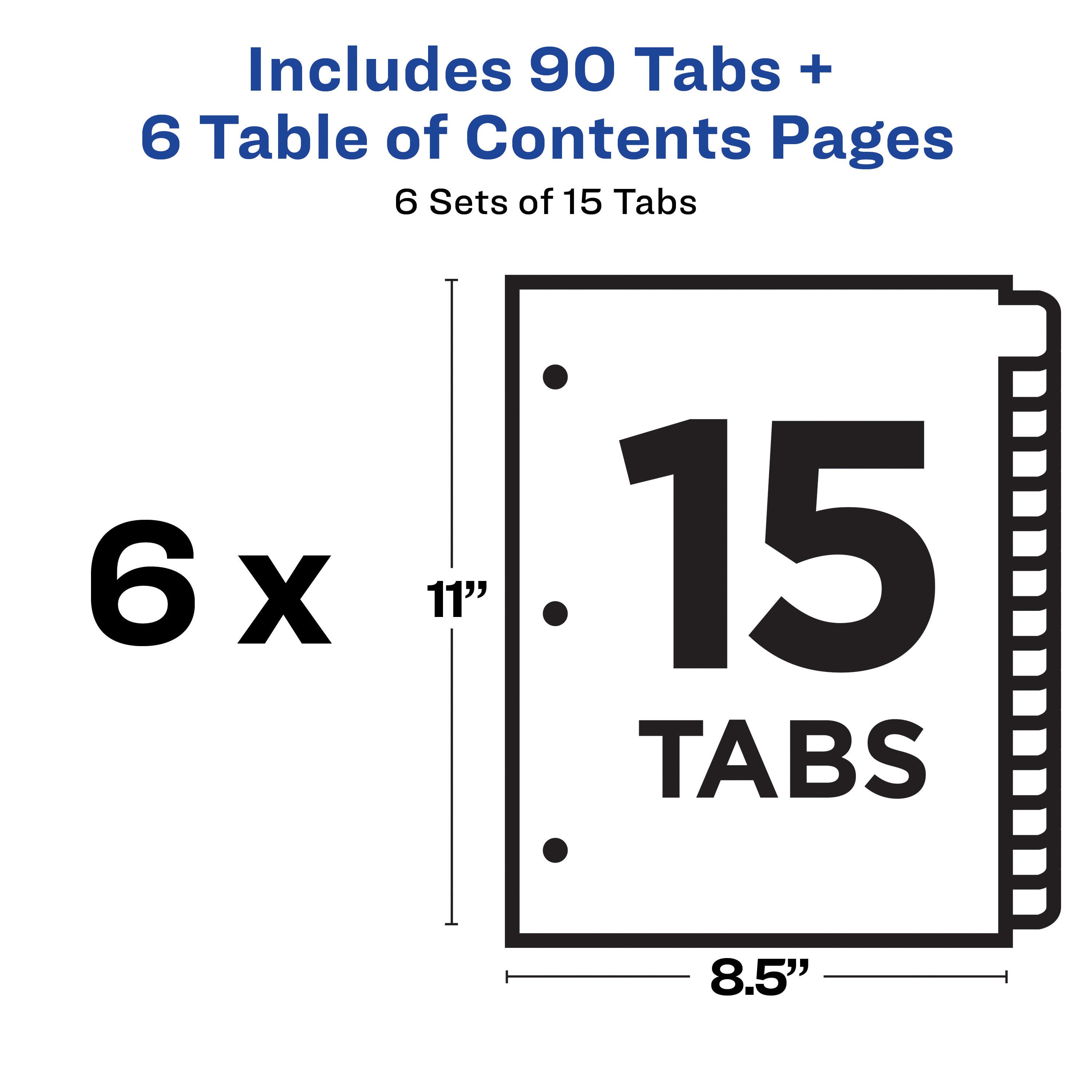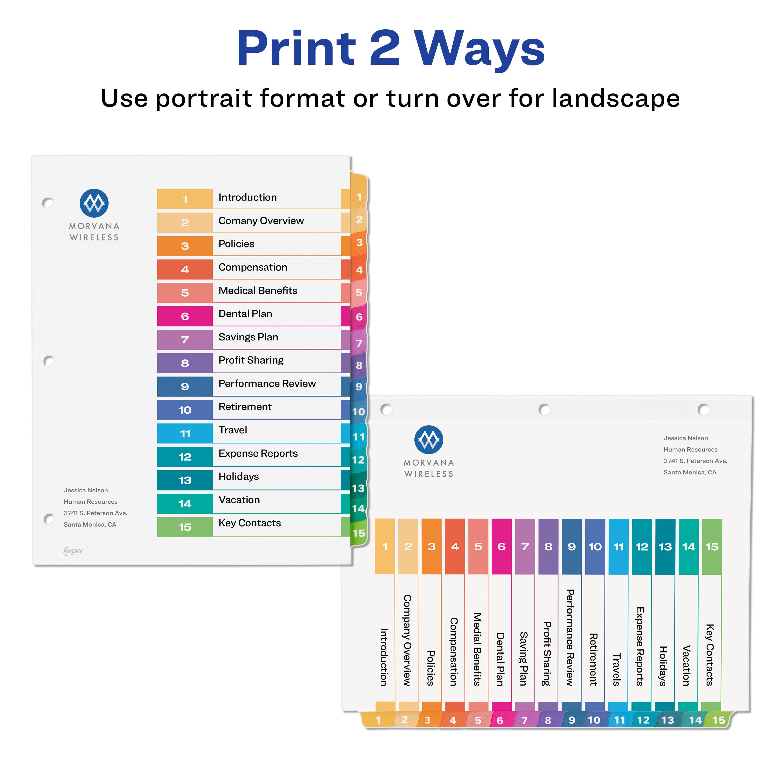 Coordinated divider system makes referencing easy and delivers a professional look. The set includes a reinforced Table of Contents page, matching preprinted tab dividers in assorted colors, added tab reinforcement, double-sided hole reinforcement on tabbed dividers and paper made of heavy stock. 2-in-1 tab design lets you pick between portrait and landscape formats. Simply print the section titles onto the Table of Contents page using your inkjet or laser printer. Tab dividers are also compatible with typewriters and copiers. Dividers are three-hole punched for use in binders. Avery offers many easy-to-use templates for Microsoft Word and other popular software programs.