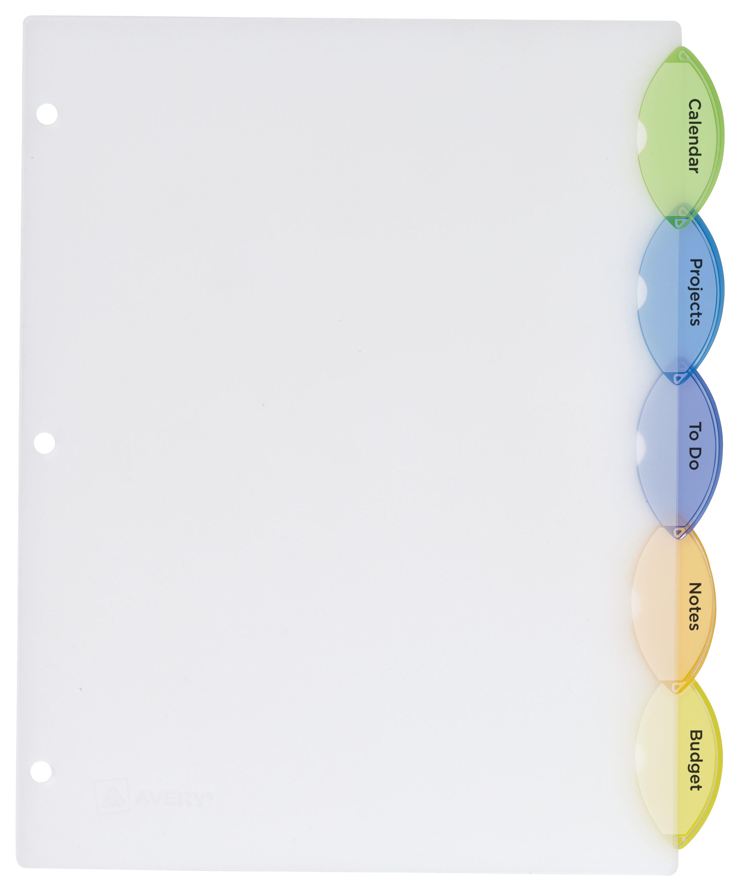 Insertable dividers are designed for laser printers, inkjet printers or typewriters. Durable plastic construction allows frequent reference. Tab inserts from the side provide a large print area and secure fit. Large tab inserts can be easily formatted and printed using Avery templates, or they can be handwritten. Dividers are three-hole punched for easy insertion in standard-size binders.