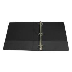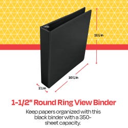 Gather records, paperwork, notes, and other essential papers with the School Smart black 1-1/2 inch round ring view binder. Our durable O ring binder with view pockets has a useful non-glare overlay on the front, back, and spine covers to allow you to insert custom labels or individual sheets for easy viewability and access. Cover pockets on the clear view binder also prevent the transfer of ink from printed materials. The O ring mechanisms are O-shaped and easy to open and close, so you can organize and store important sheets of paper in your 3 ring view binder. Made of polypropylene, the sturdy binder also has two deep inner pockets to hold loose sheets of paper. This O ring file has a 350 sheet capacity, and the entire black binder measures 10-1/2 x 11-1/2 inches.Features