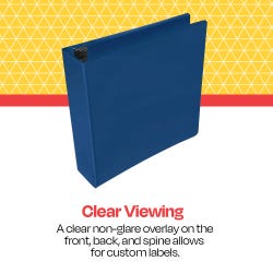• Non-glare, PVC-free overlay on the front, back, and spine covers allows for customization on all three sides while ensuring ink from printed materials does not smear or transfer onto the binder