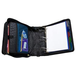 Case·it 4-inch zippered D-ring binder features a 5-color tabbed expanding file, inside mesh pockets, handle and shoulder strap. The ripstop material's square pattern traps punctures to prevent tearing, and the patented angled zipper keeps gusset out of the way when writing. Binder measures 13-1/4 L x 13-1/4 W x 5 D inches. Contents of binder sold separately.Features