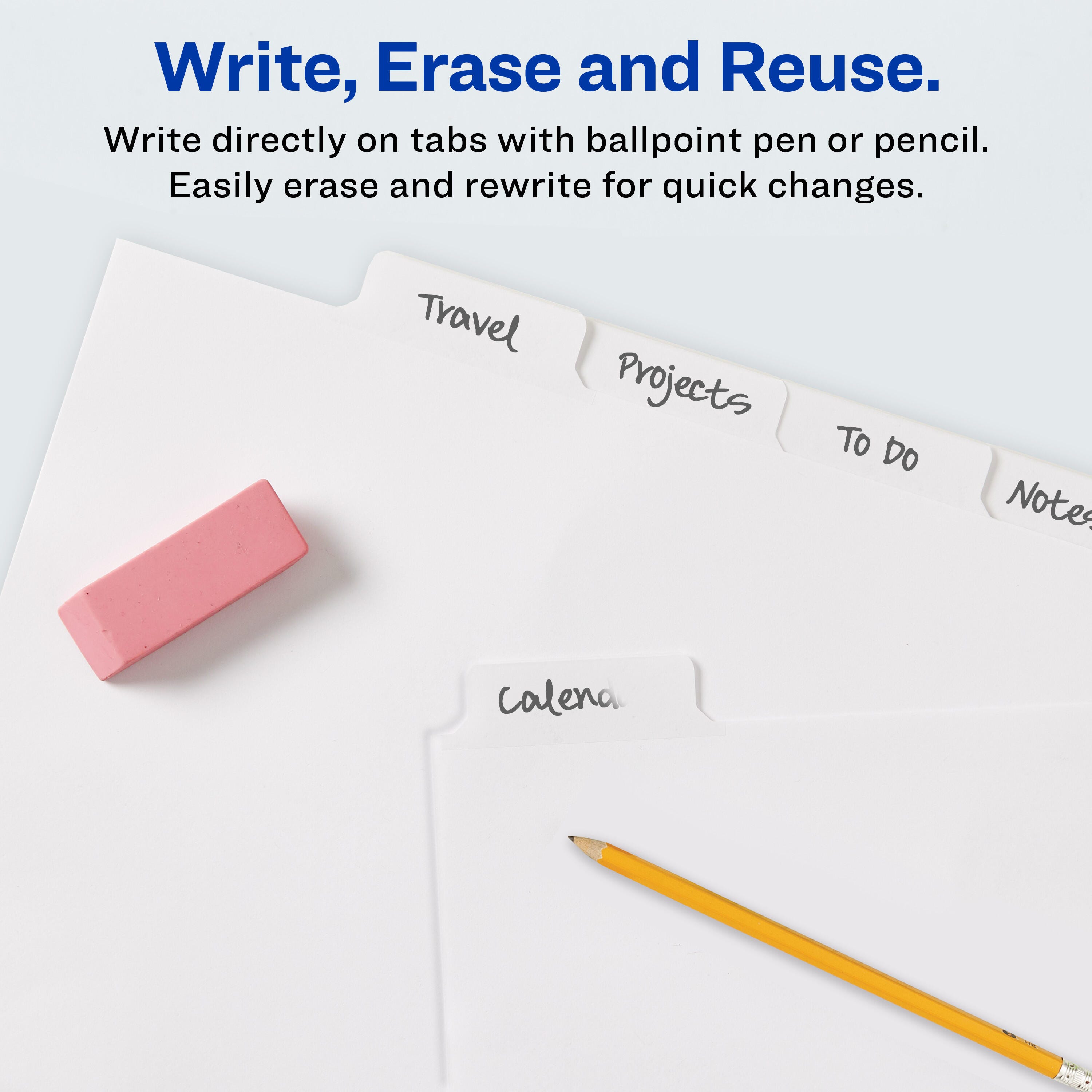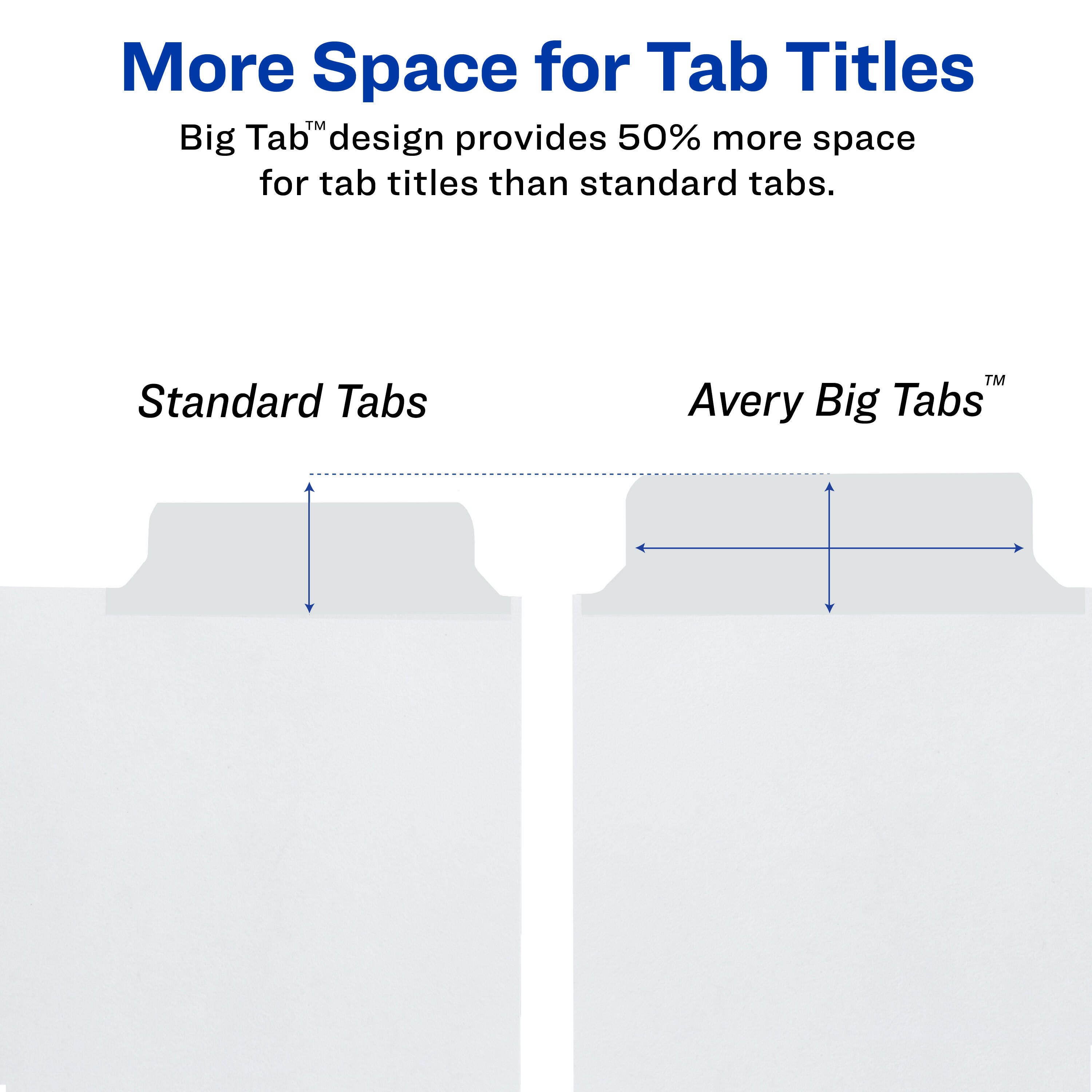 Big Tab Write and Erase sturdy paper dividers let you write, erase, and reuse your dividers for easy changes at any time. The Big Tab design offers 1-1/2 times more writing space than standard divider tabs. Not printer compatible.