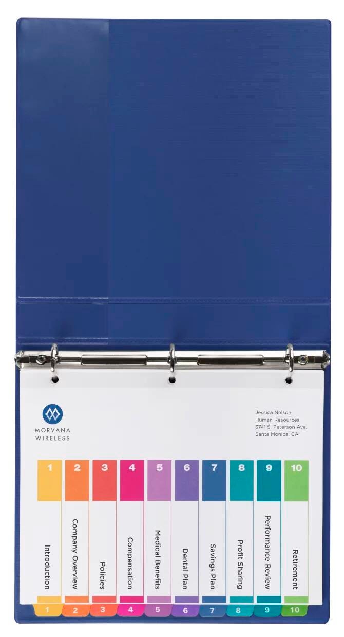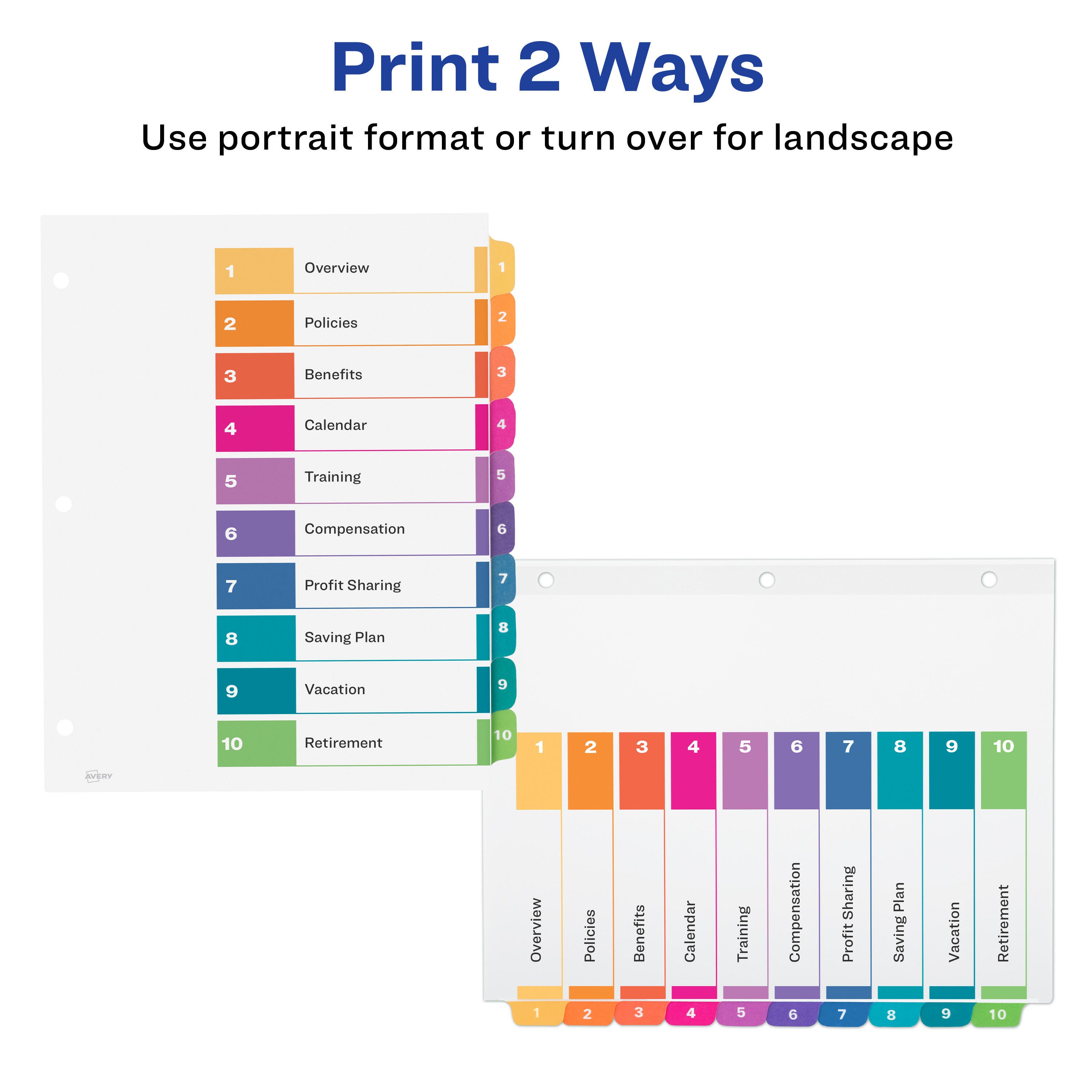 Avery Ready Index Table of Contents Dividers, 1-10 Tabs, are the fastest way to organize with impact. The coordinated system of a reinforced Table of Contents page and matching preprinted tab dividers makes referencing easy while delivering a professional look. Customize the Table of Contents page by adding section titles, as well as graphics or a company logo. Extended tab reinforcement and double-sided hole reinforcement on heavier weight paper prevents tearing, even with frequent use. Use in portrait or landscape formats. Easy to customize with free templates and designs at Avery Design and Print (avery.com/print). Dividers contain 20 percent minimum post-consumer recycled paper. For laser and inkjet printers.
