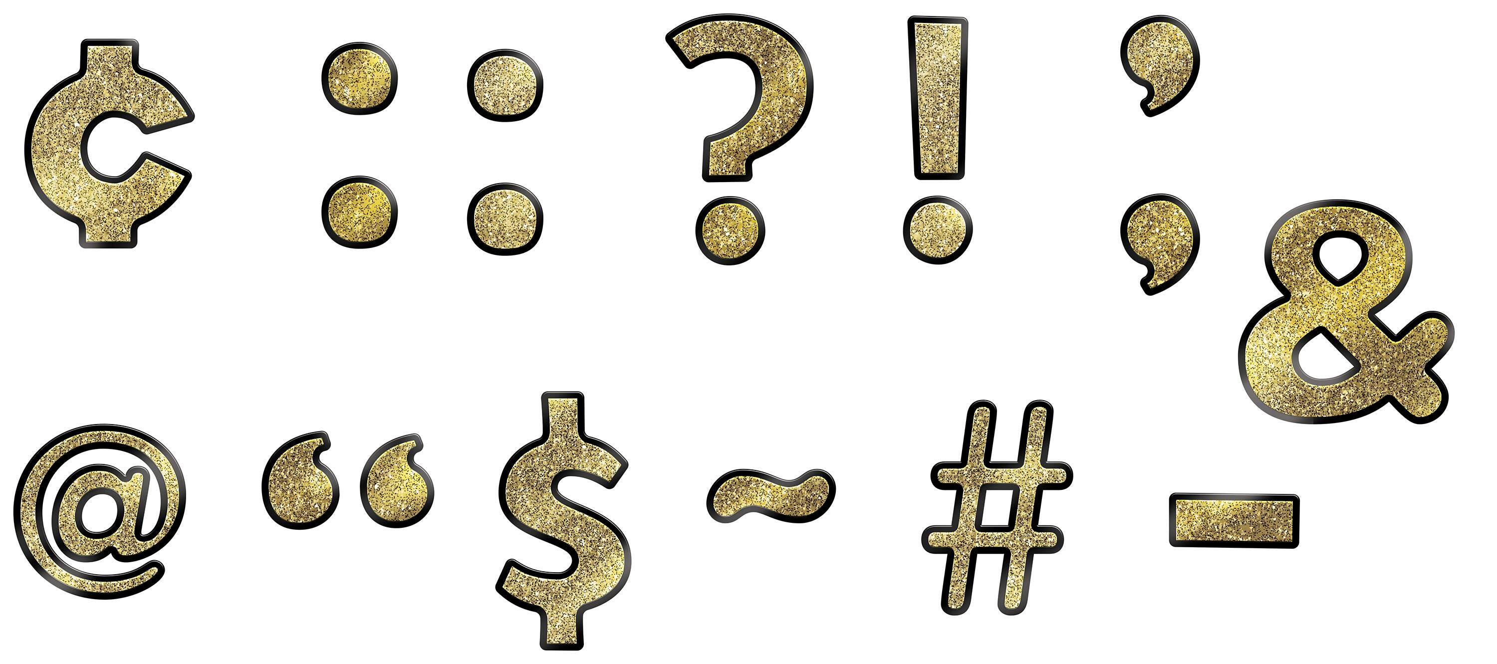 Create displays with the Sparkle + Shine Collection EZ Letters combo pack. This 219-piece pre-punched set includes these pieces: 70 uppercase letters, 87 lowercase letters, 20 numbers, 20 punctuation marks, and 22 symbols. All characters feature gold glimmer to help your message stand out!Includes: