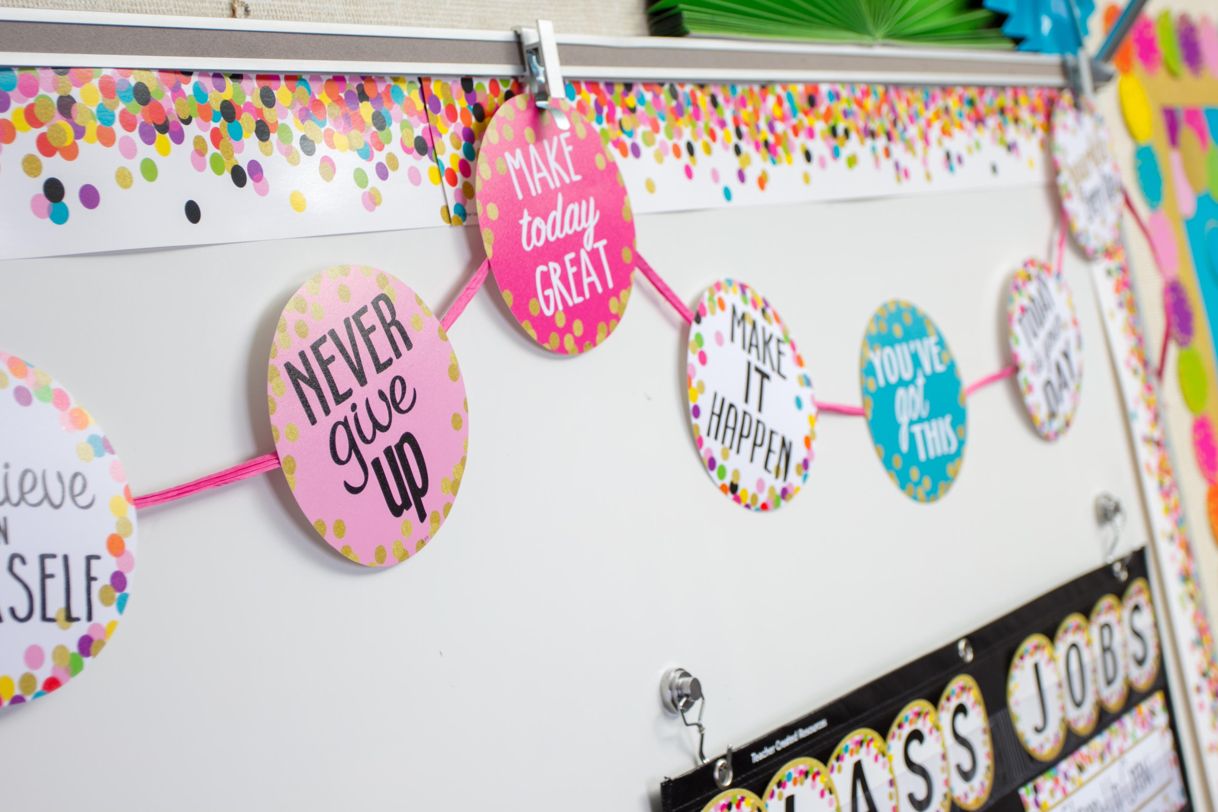 - Round, colorful Confetti Positive Sayings bulletin board acessories are ready to brighten displays, frame doorways, add edging to party tables, and beyond