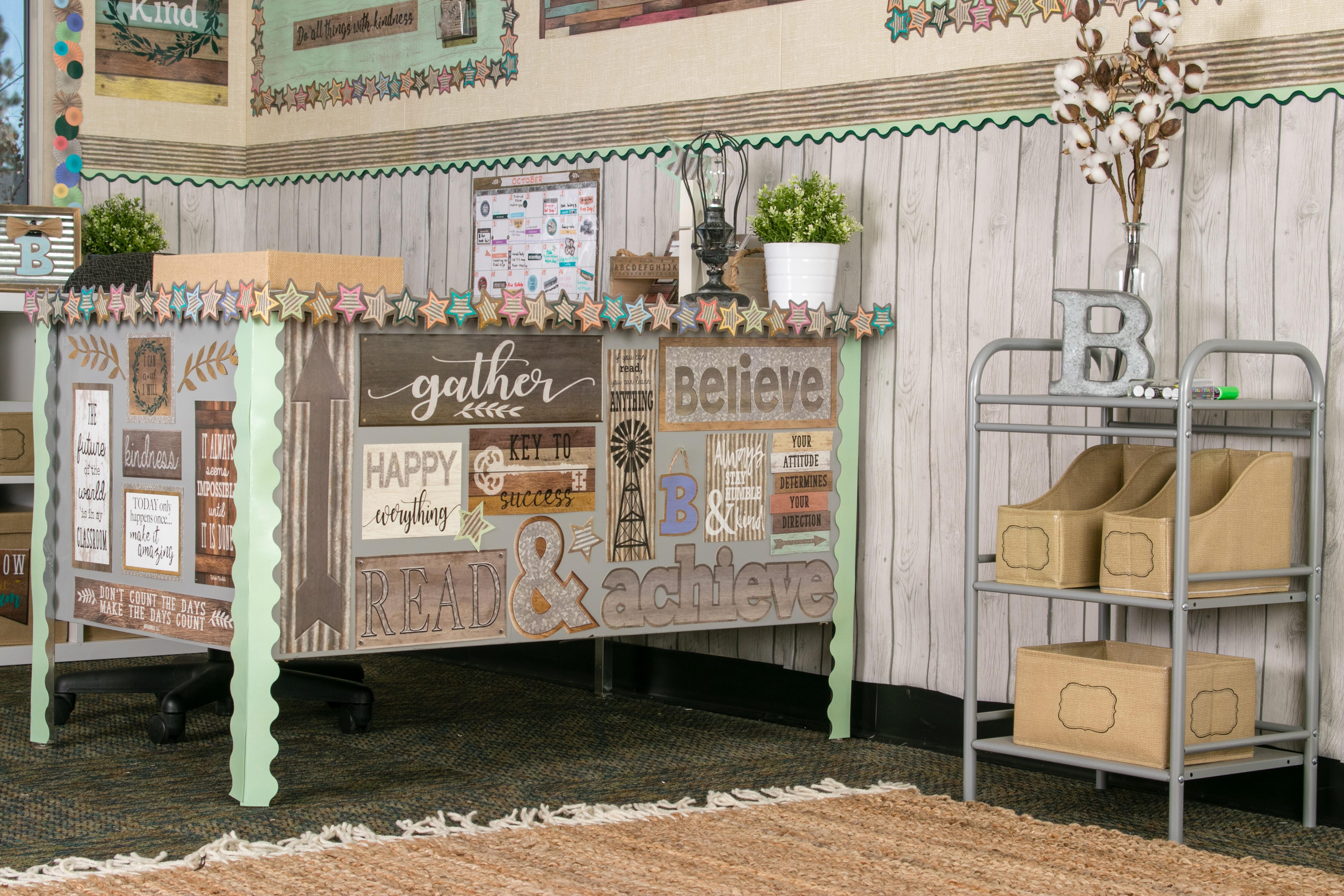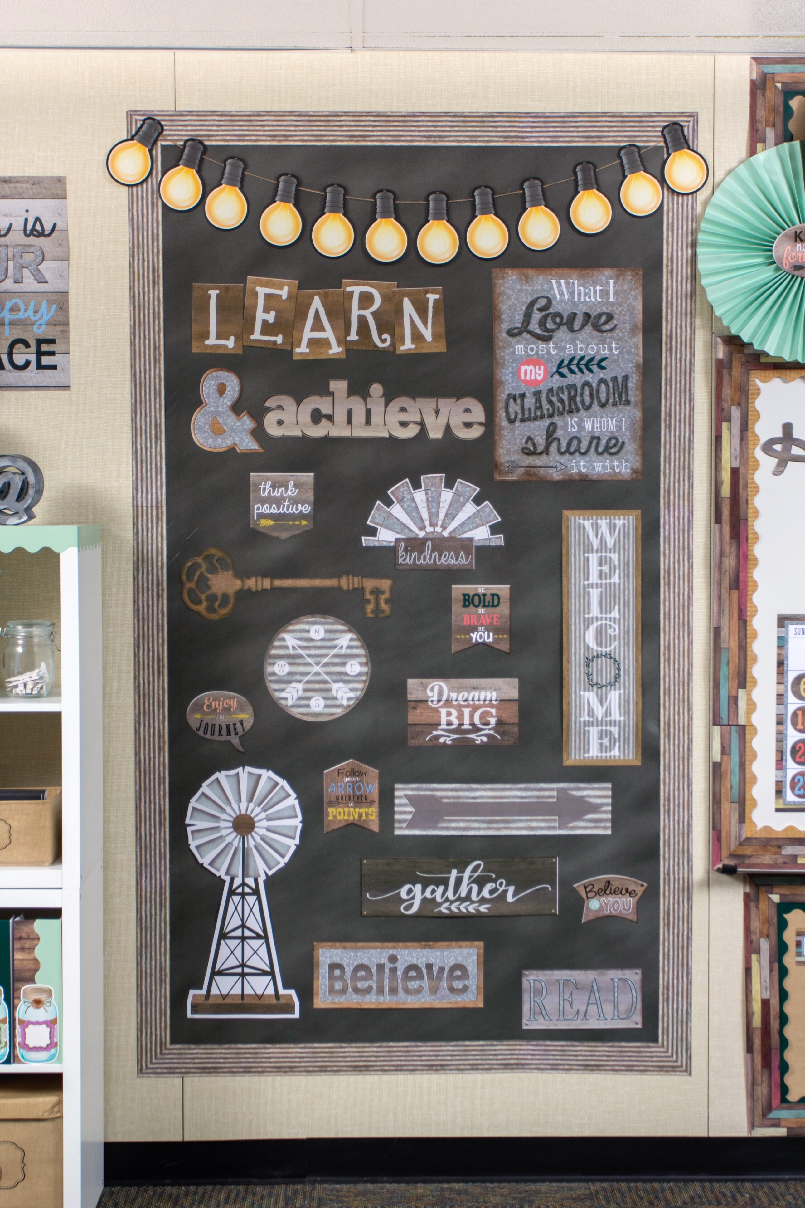 The reclaimed wood and galvanized metal inspired Wall Decor Bulletin Board set is the perfect way to bring a farmhouse look into your classroom. Use each piece separately around your room to create a rustic look or put them all together to create the perfect gallery wall that will transform your classroom into a space that will make you and your students feel right at home. Windmill measures 10-5/8 x 23 inches.Features
