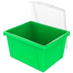 These storage bins are the ultimate companion for your bookshelf or cubby. The easy-to-grip handles are perfectly sized for big and small hands. They are made of impact-resistant plastic and come in wonderfully bright colors. Use them to organize your room and store all your supplies. A clear snap-on lid is included. The outside dimensions of the bin are 14-3/4 x 11-1/4 x 8 inches, and the inside dimensions are 12-1/2 x 10 x 7-3/4 inches.Features