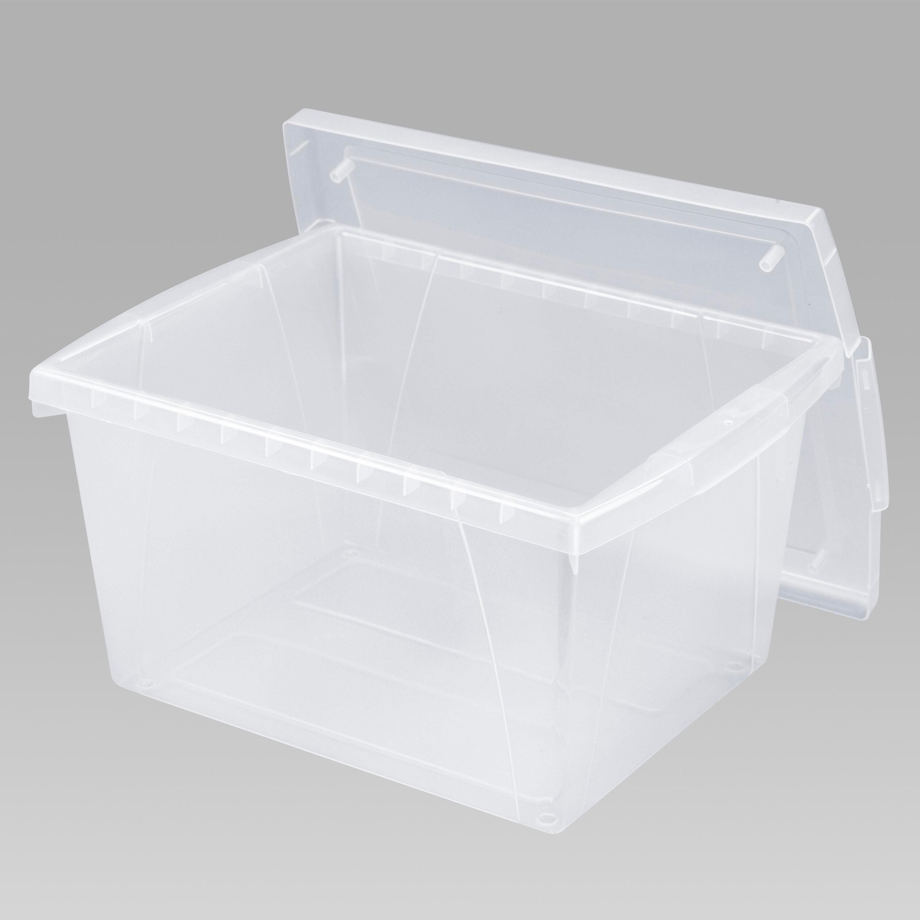 These storage bins are the ultimate companion for your bookshelf or cubby. The easy-to-grip handles are perfectly sized for big and small hands. They are made of impact-resistant plastic and come in wonderfully bright colors. Use them to organize your room and store all your supplies. A clear snap-on lid is included. The outside dimensions of the bin are 14-3/4 x 11-1/4 x 8 inches, and the inside dimensions are 12-1/2 x 10 x 7-3/4 inches.Features