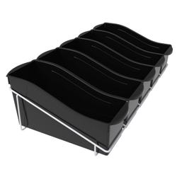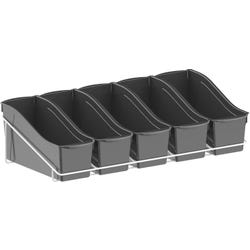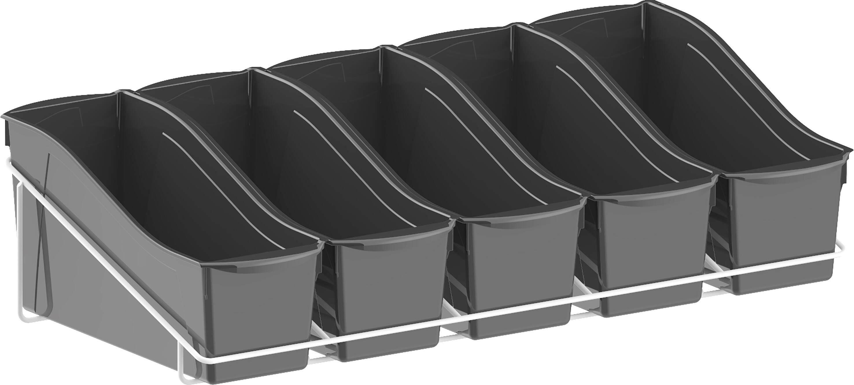 This set of 5 book bins includes a wire rack to instantly create an organized space. The metal wire rack is made white epoxy coated steel for ultimate durability. The bin will not tip over when placed in the rack, even when they are overloaded with books. All the bins come in a deep black color and feature integrated carry handles. Perfect for a reading corners or STEM / STEAM organizing. Fits on desktops or 15 inch shelves. Can be wall mounted; hardware not included. Colors may vary.Features