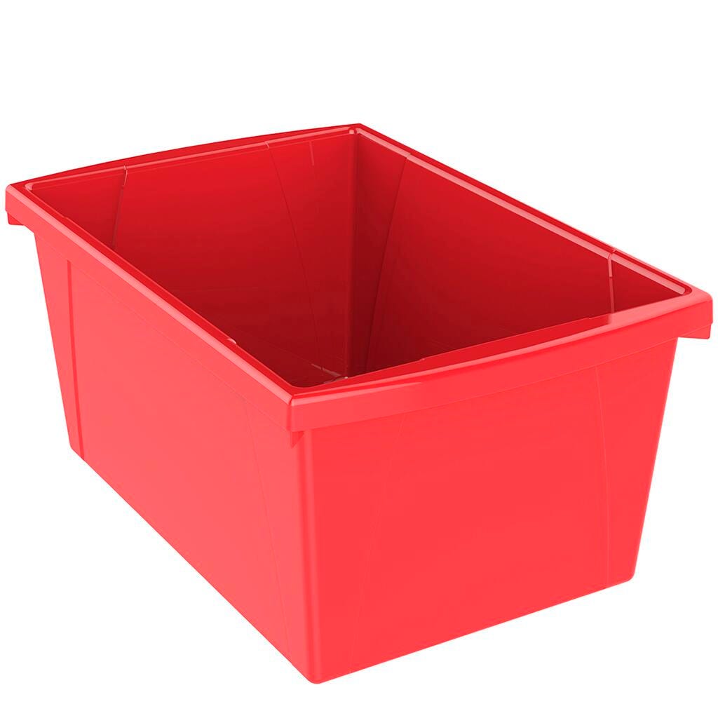 These storage bins are the ultimate companion for your bookshelf or cubby. The easy-to-grip handles are perfectly sized for big and small hands. They are made of impact-resistant plastic and come in wonderfully bright colors. Use them to organize your room and store all your supplies. The outside dimensions of the bin are 18 x 10-3/4 x 8-1/2 inches, and the inside dimensions are 15-1/2 x 10-1/2 x 8-1/3 inches. This pack contains 6 bins, with one each in red, yellow, green, blue, teal, and purple.