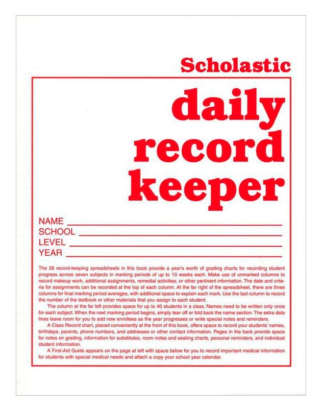Scholastic Instructor Daily Record Keeper consists of 64 pages that measure 8-1/2 in x 11 inches is wire bound to open flat. Book includes 28 double page sections for marking periods 4 to 10 weeks. Book also Includes space for pupils birthdays, phone numbers, parents names, addresses and five pages devoted to special notes. Names need to be recorded only once, merely tear off perforated name section when next marking period starts.