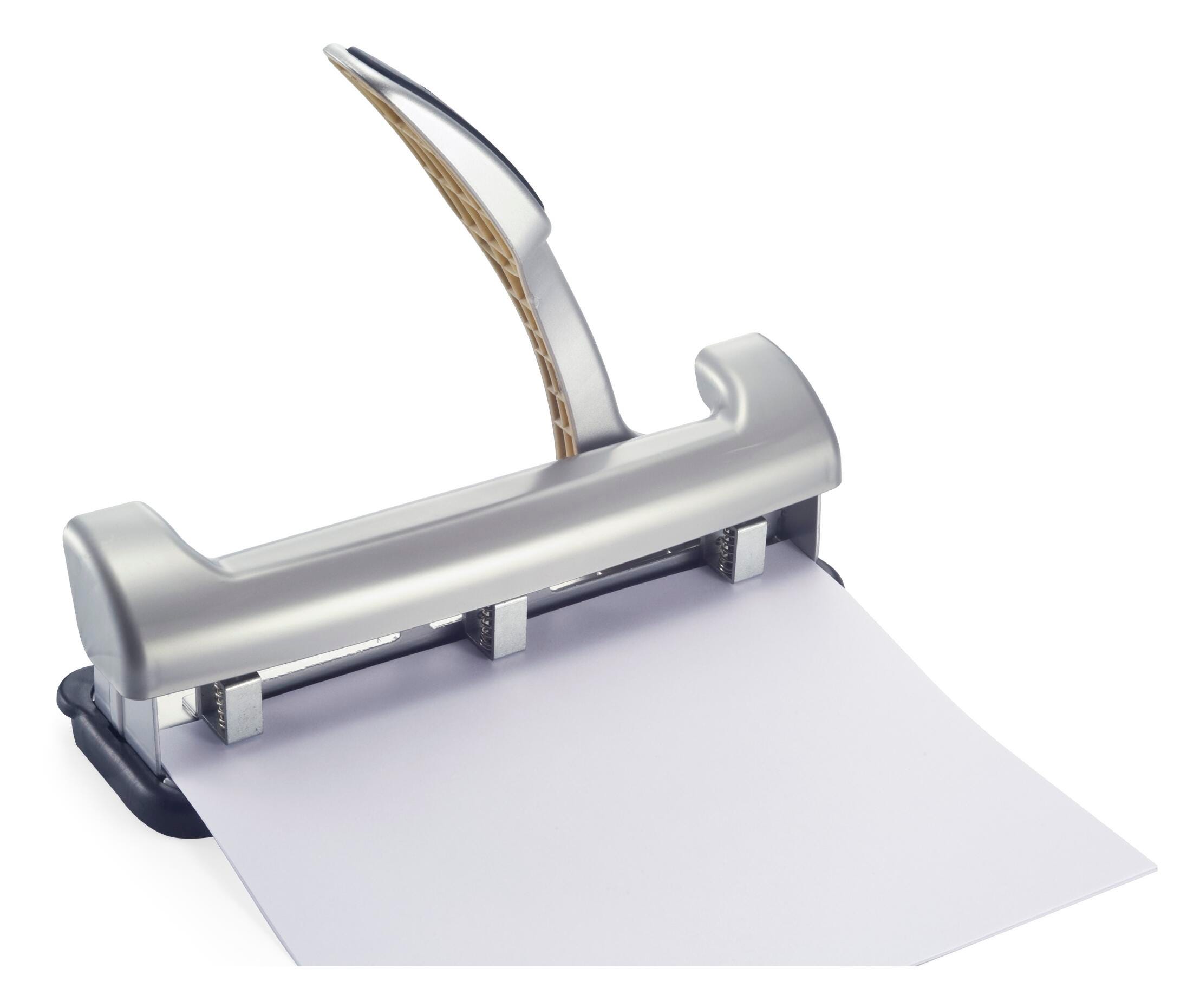 Adjustable 2-3 hole lever action punch for both standard 3 hole and 2 hole punching. Ergonomic padded handle makes punching easier. Calibrated centering device for punching accuracy. Durable metal construction and no mar capacity providing extra punching capacity with ease. Easy to remove view window to observe chip build up, chip dispersal mechanism to prevent jams. Punches up to 25 sheets of 20 lb. paper.Features