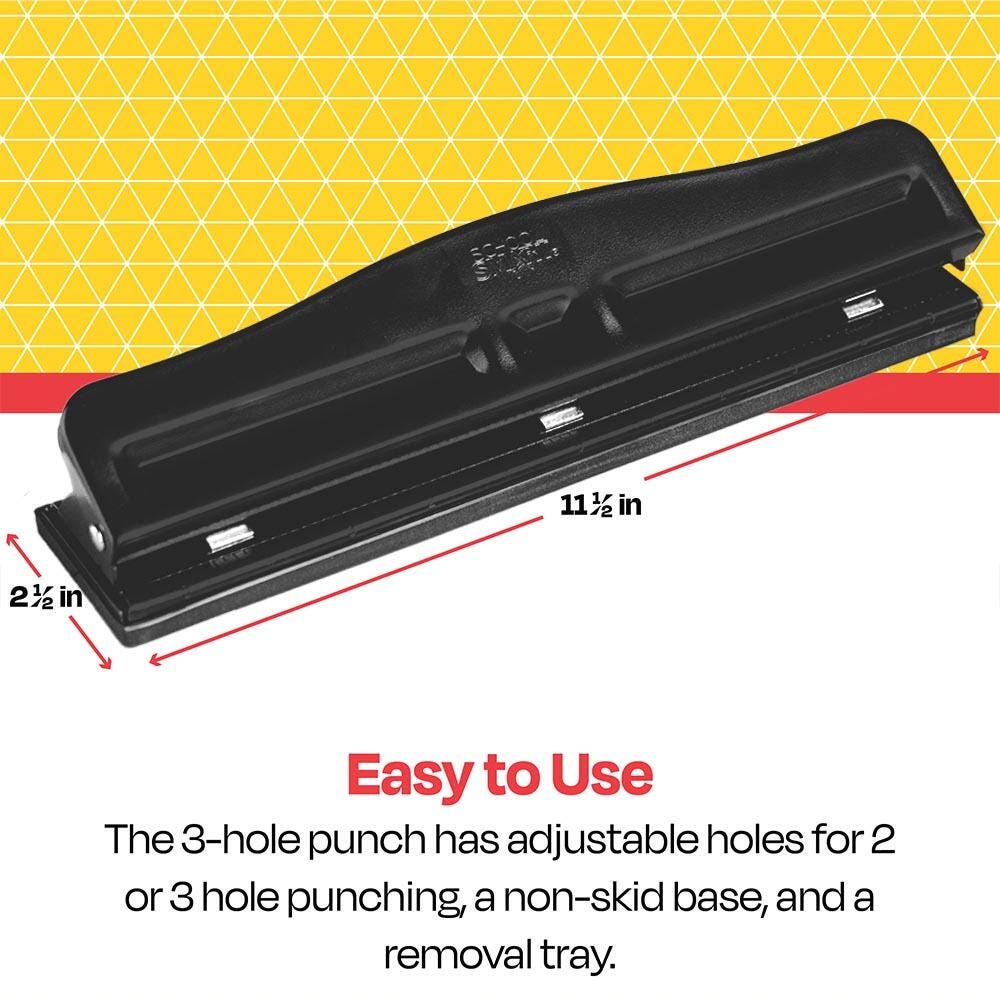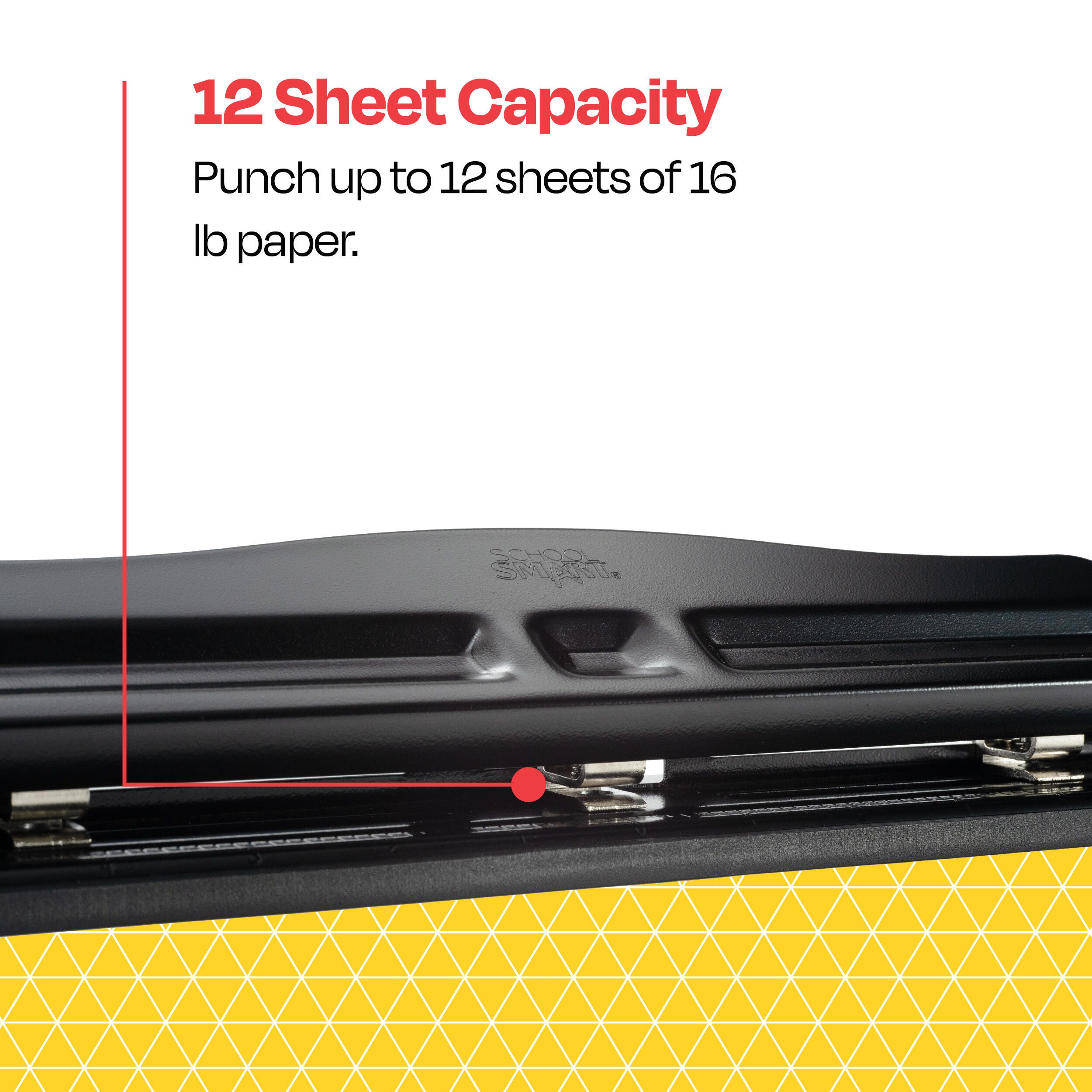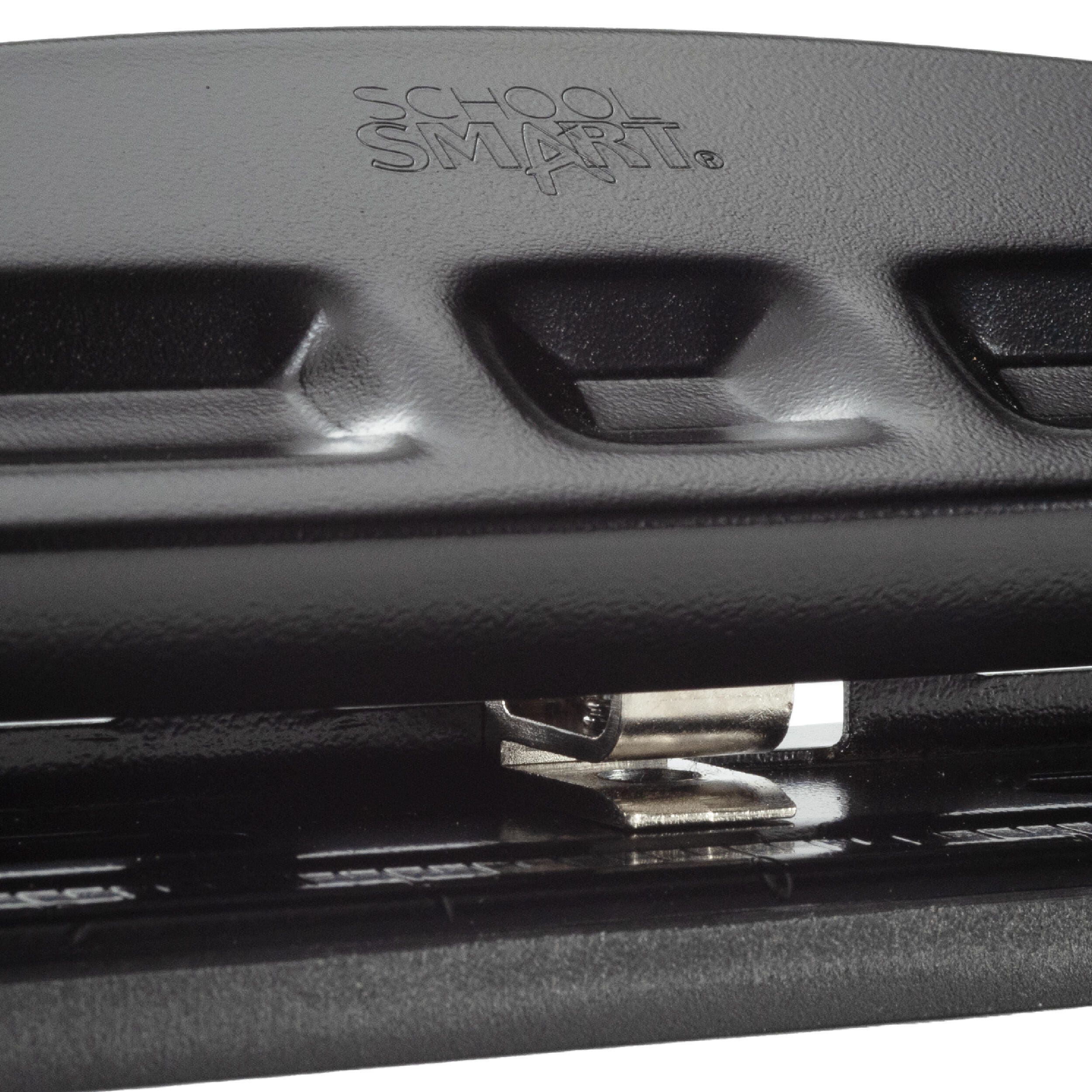 The School Smart adjustable 2 or 3 hole punch features rugged reliability and can punch up to 12 sheets of 16 lb paper at a time. The hole puncher is easy to use by students and teachers, and the three-hole adjustable paper punch can be easily transformed into two-hole punch by neutralizing the center head. Add the desktop hole punch to your classroom, office, studio, or home. The classic paper puncher has a sleek black enamel finish, non-skid base with removable chip tray, and an accurate built-in centering guide.