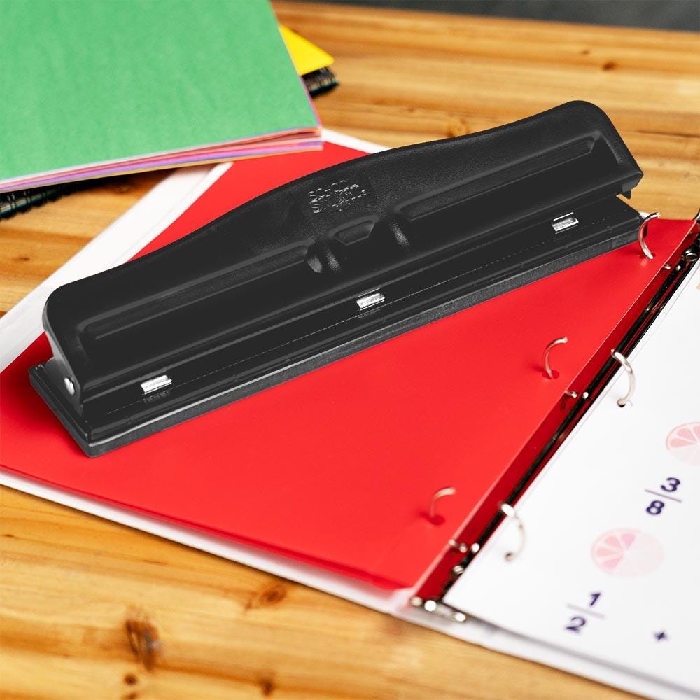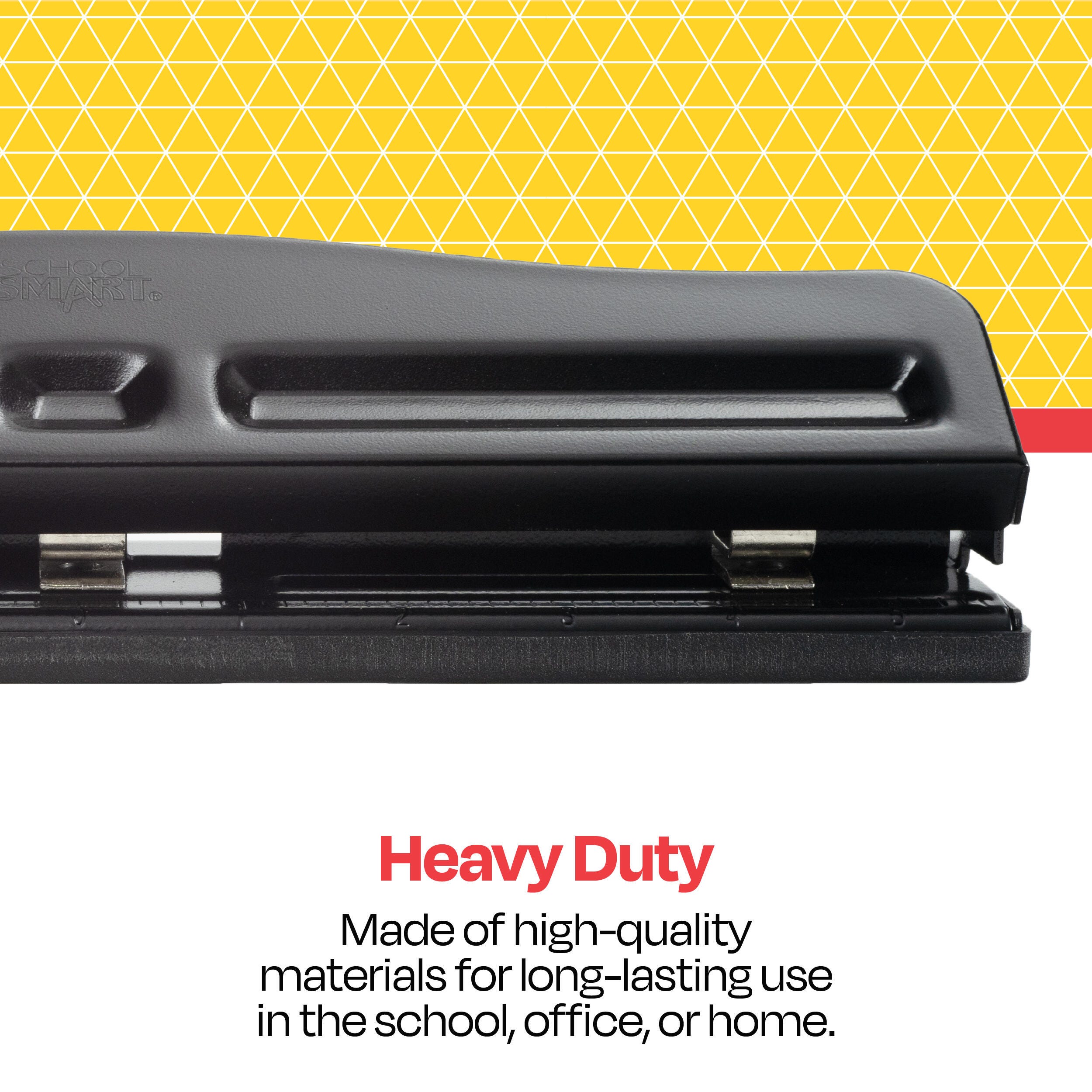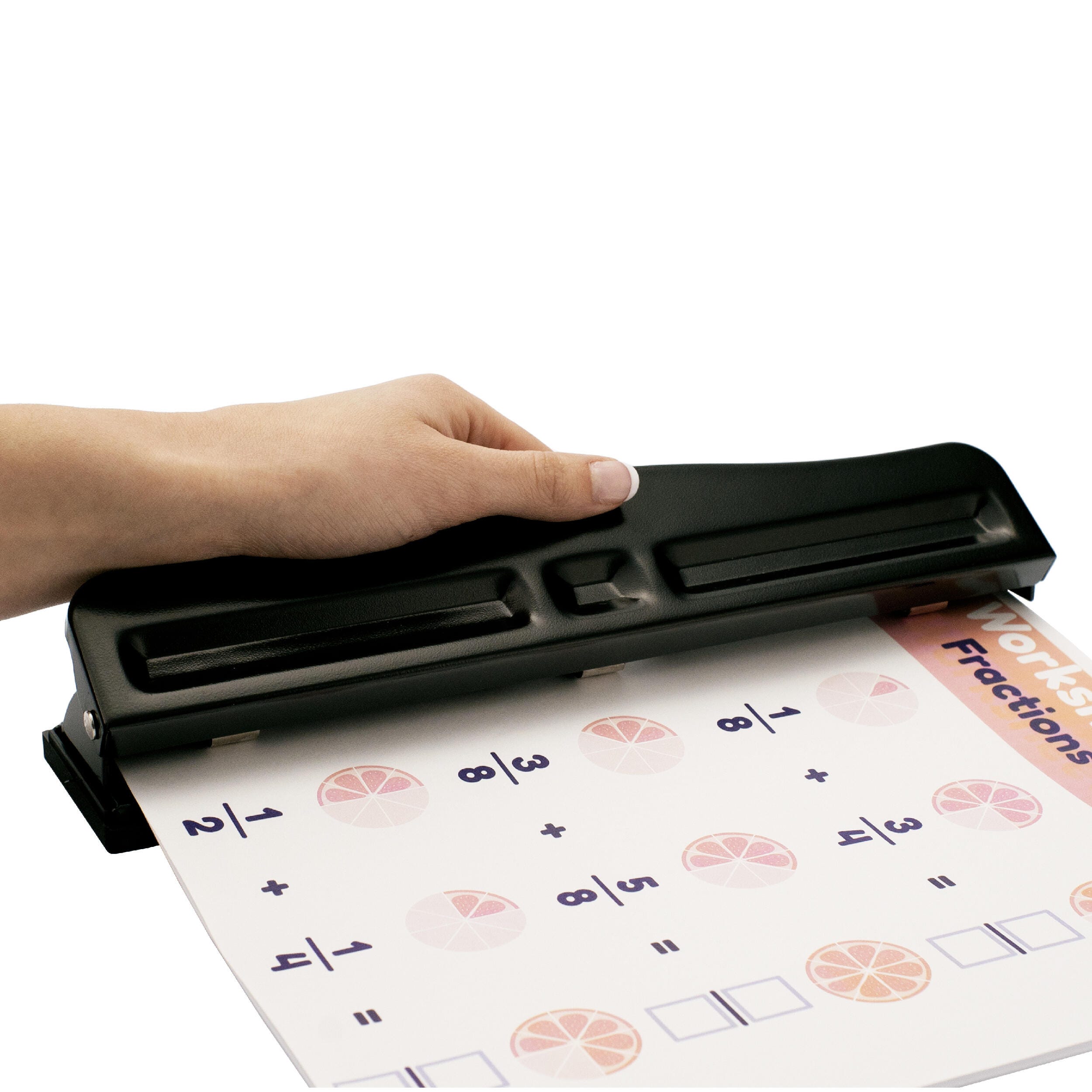 The School Smart adjustable 2 or 3 hole punch features rugged reliability and can punch up to 12 sheets of 16 lb paper at a time. The hole puncher is easy to use by students and teachers, and the three-hole adjustable paper punch can be easily transformed into two-hole punch by neutralizing the center head. Add the desktop hole punch to your classroom, office, studio, or home. The classic paper puncher has a sleek black enamel finish, non-skid base with removable chip tray, and an accurate built-in centering guide.