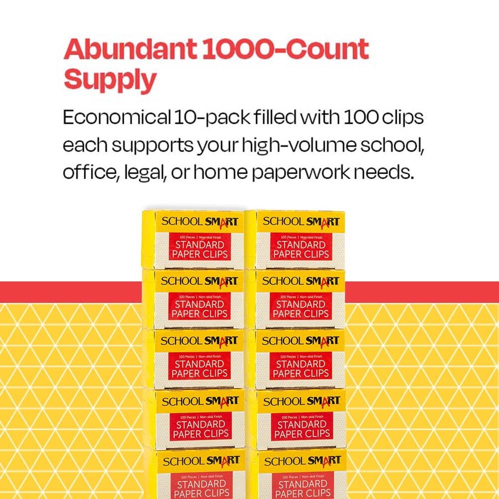 Made from the highest quality steel, School Smart Non-Skid Paper Clips are the perfect paper organizer aid for home, school, or office needs. Each 1-1/4 inch standard size clip features a bright, corrosion-resistant silver finish for a polished look against both professional or personal documents. Plus, ridges on the surface of each paperclip keep your clipped papers neatly aligned together and eliminate skidding. Total of 1,000 paperclips are separated into 10 packs of 100 clips each.