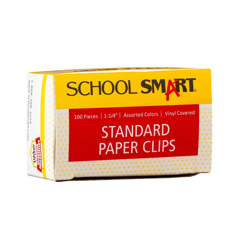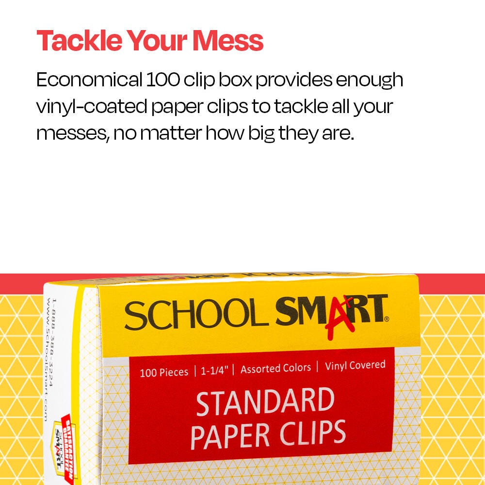 Add fun and function to your office supplies with colorful Paper Clips from School Smart. These handy paper clips have a colorful vinyl coating for rust-resistance and durability and measure 1-1/4 inches. Their smooth surface helps prevent snags and marks on your paperwork. There 100 per pack in an assortment of bright colors for filing, grading, document transport, organization, arts and crafts, and more.