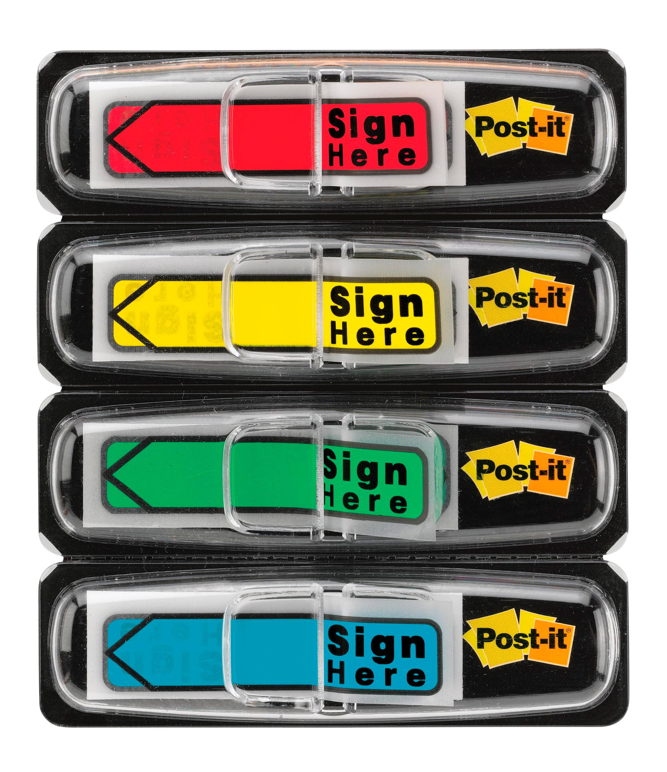 Post-it Message Flags with "Sign Here" messaging in assorted colors are 1/2 x 1-7/10 inches and ideal for marking documents without writing on them. They stick securely and remove cleanly without damaging documents. The dispenser keeps flags organized and easy to find. Pack contains 30 flags per dispenser and 4 dispensers per pack for a total of 120 flags.