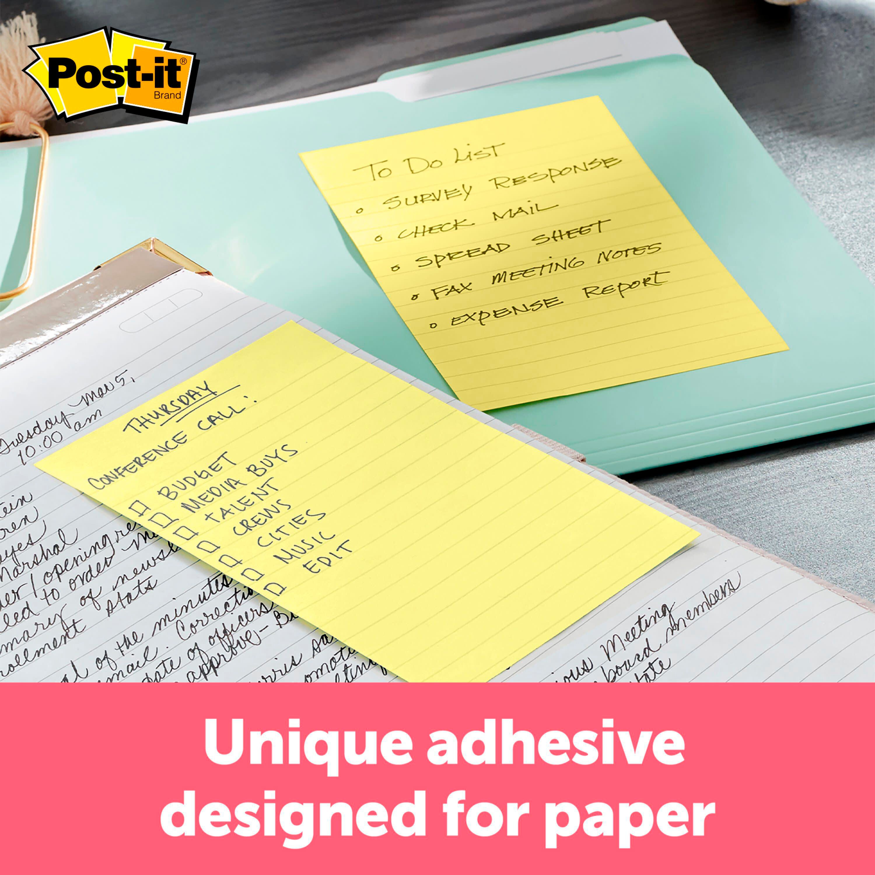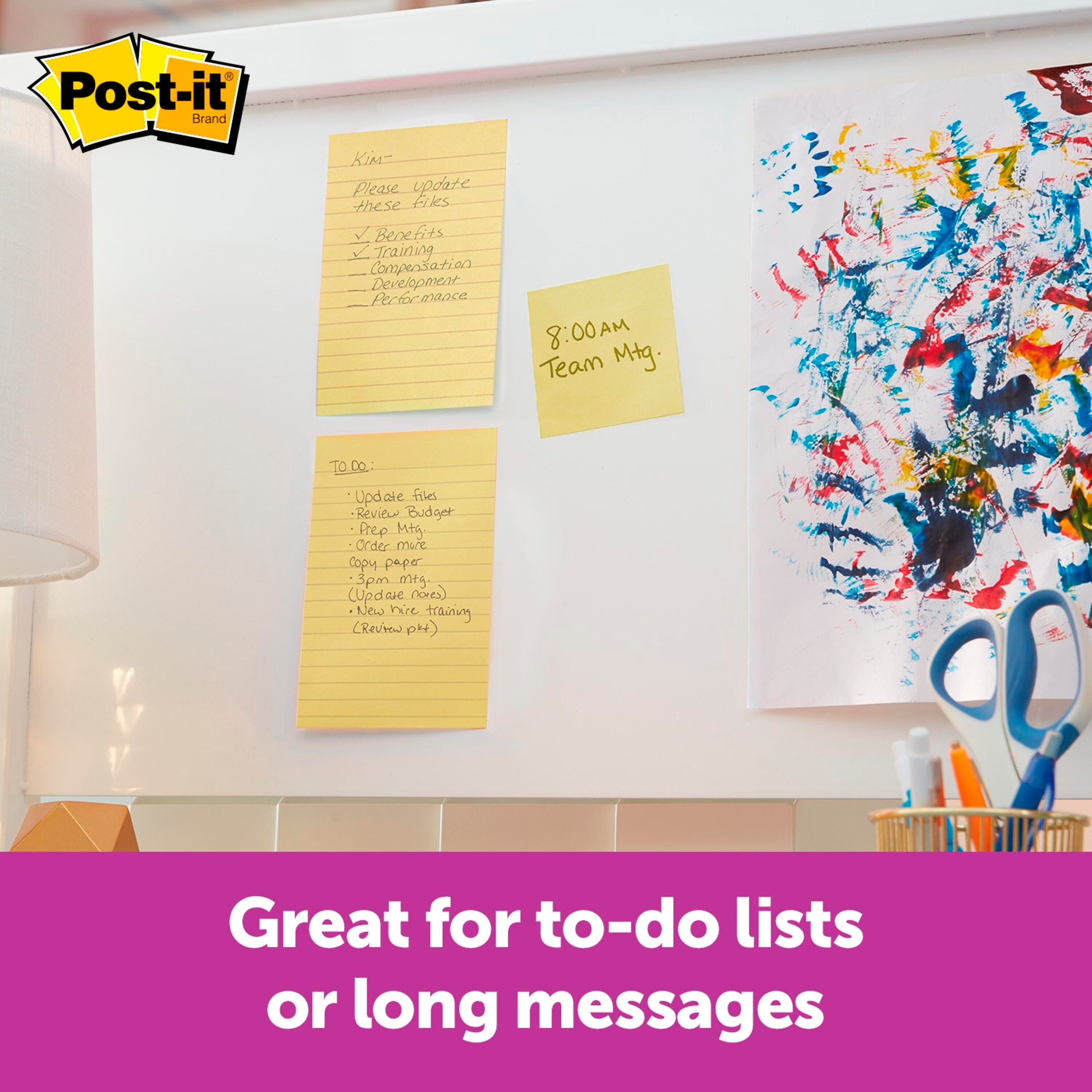 Post-it Super Sticky Notes Stick Practically Anywhere! Revolutionary adhesive technology ensures your notes will stick securely to more surfaces. Now you can stick your notes where they will really get noticed...like monitors, doors and walls! The 4 x 6 inch note size is ideal for longer to-do lists and the lines will help to keep everything straight! Trust Canary Yellow, the most familiar color, with your most important messages.Features