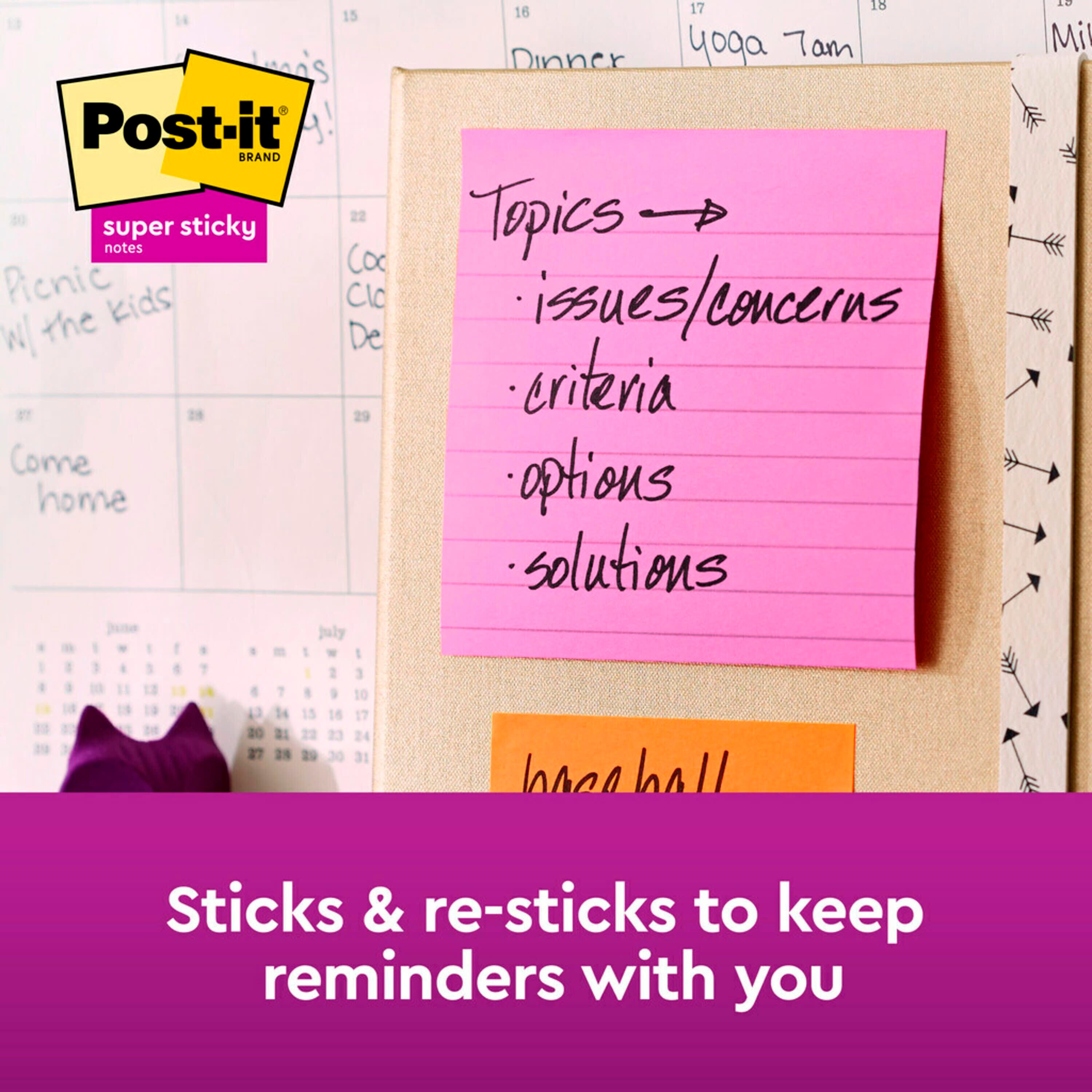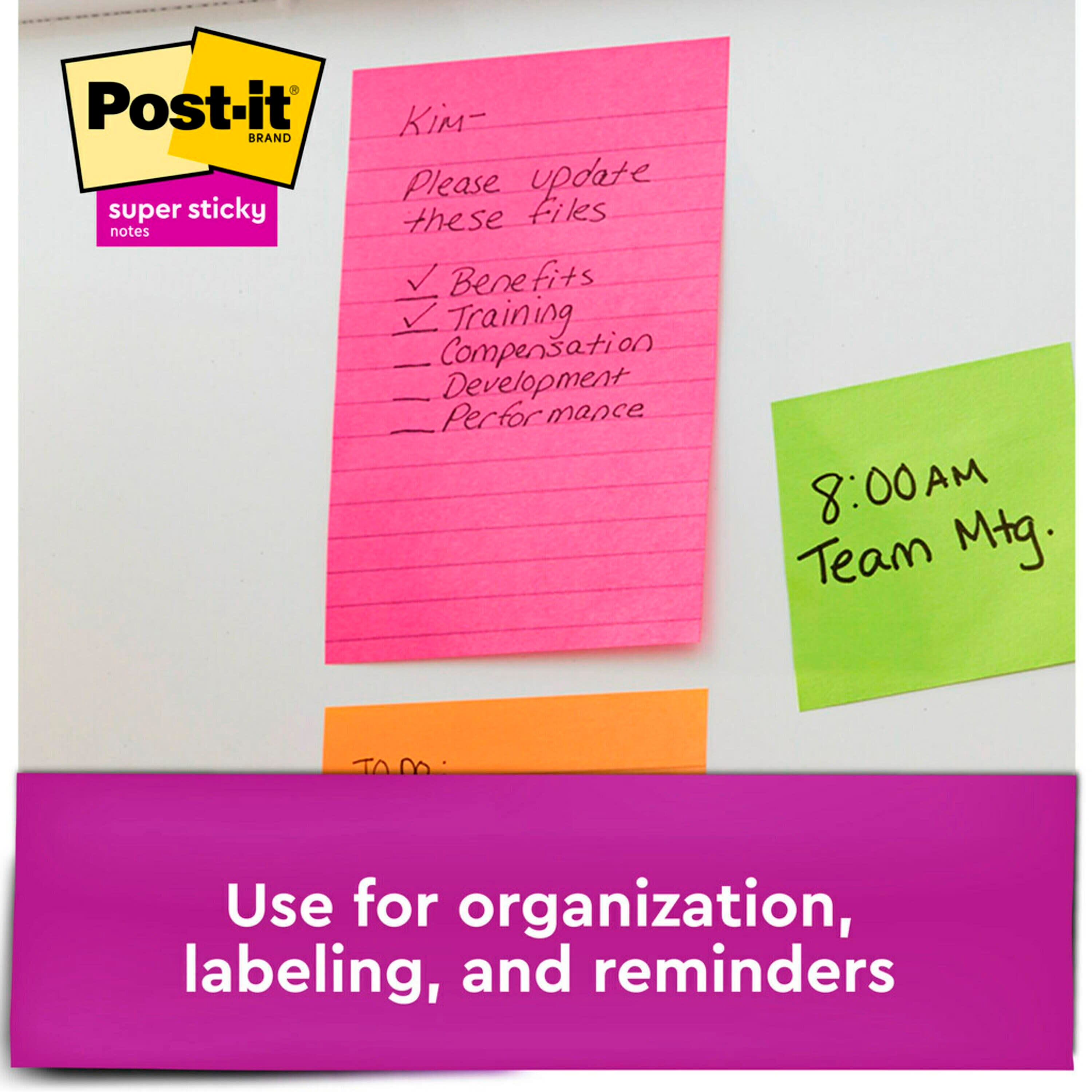 Super sticky notes hold stronger than the original Post-it notes and the adhesive is made with 67% plant-based material by weight. They are ideal for vertical and hard-to-stick surfaces like doors and walls, yet removes and repositions easily. The paper is sourced from certified, renewable and responsibly managed forests and is recyclable. Includes assorted colors in fuchsia, grape, limeade, turquoise, and ultra yellow.Features