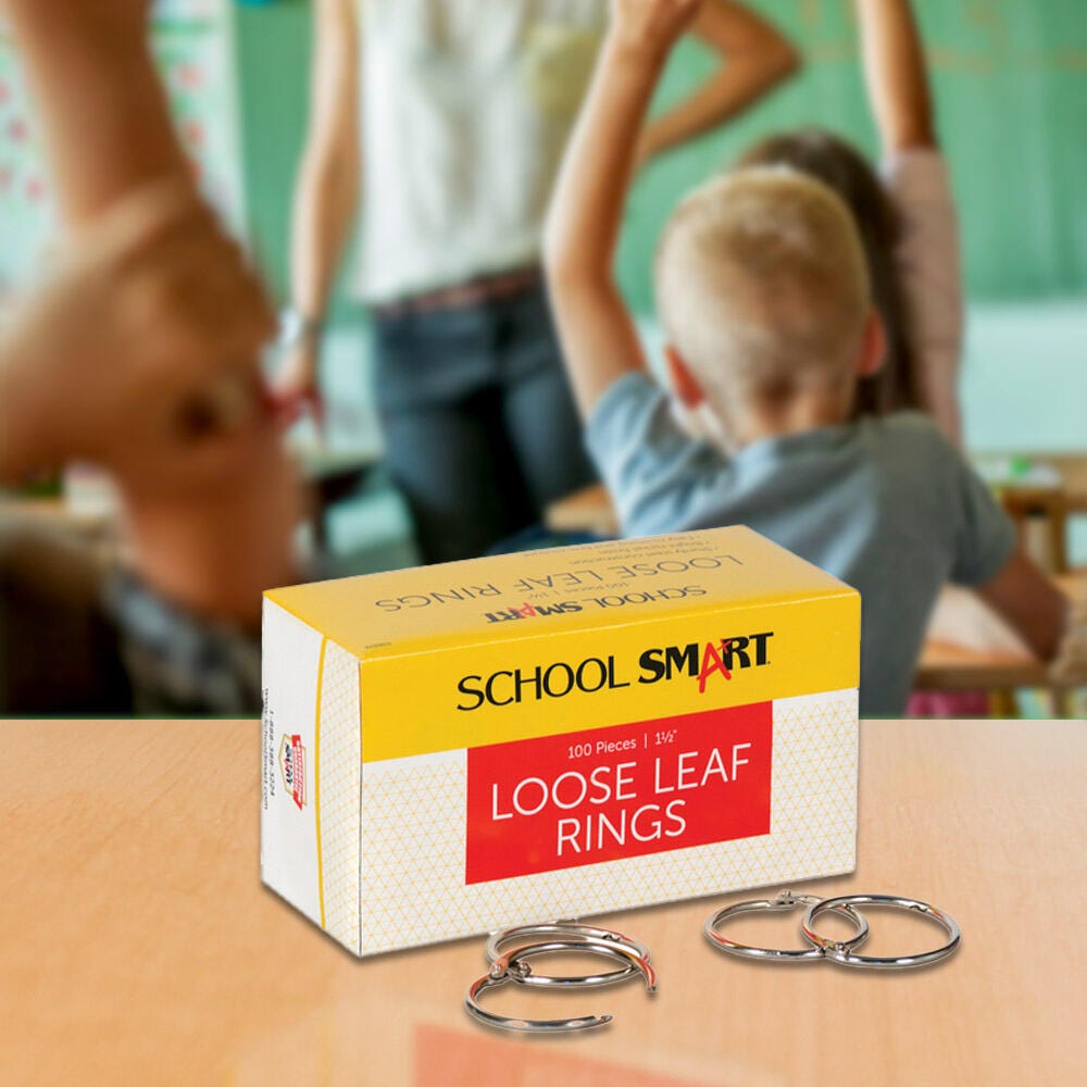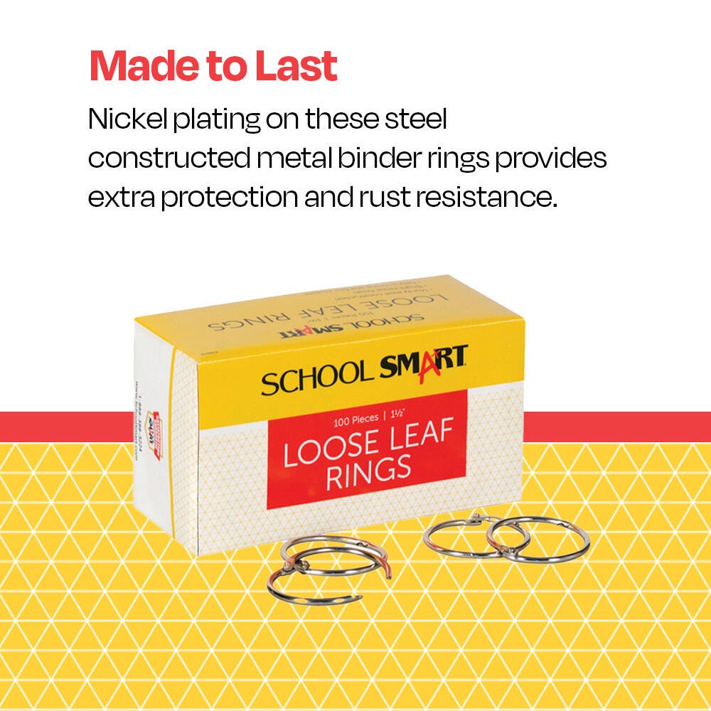The Loose Leaf Rings from School Smart offer an easy-to-use solution for jumbled folders and files. These nickel-plated steel rings are easy-opening and provide a firm closure that securely the contents on the ring. These handy rings are a perfect choice for compiling paperwork or small items together, including loose memo filings, index cards, paper or fabric swatches, key rings, and more. This pack delivers 100 rings that have a 1-1/2 inch diameter.