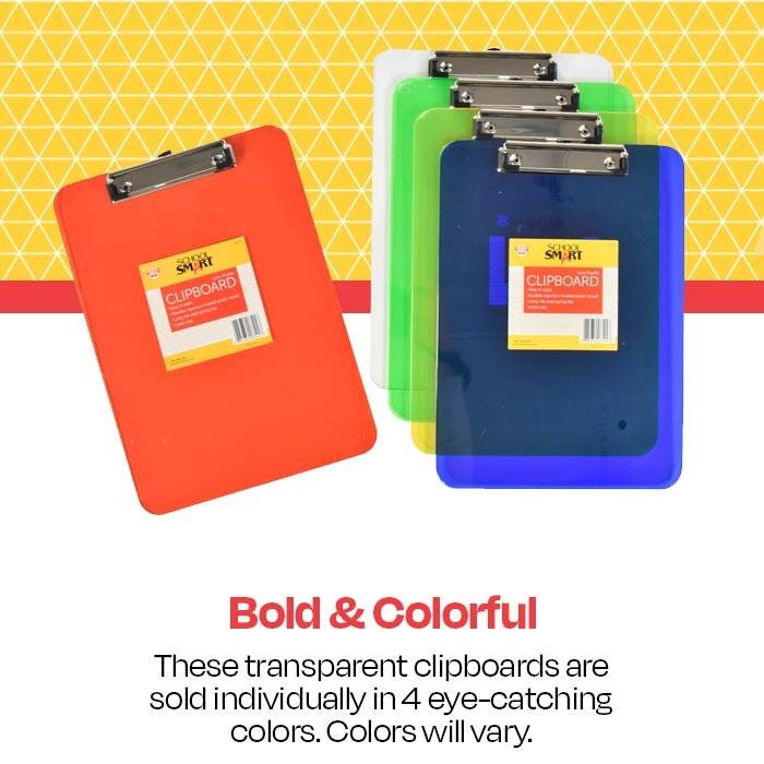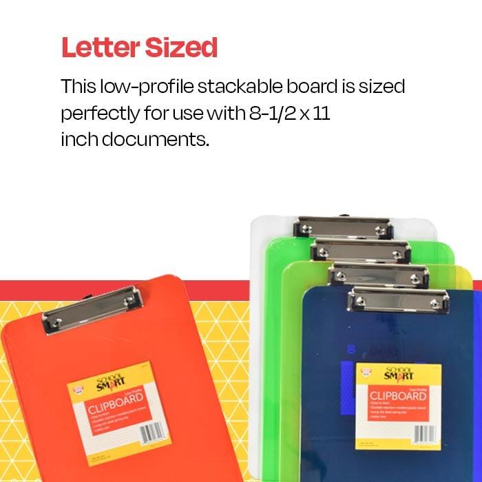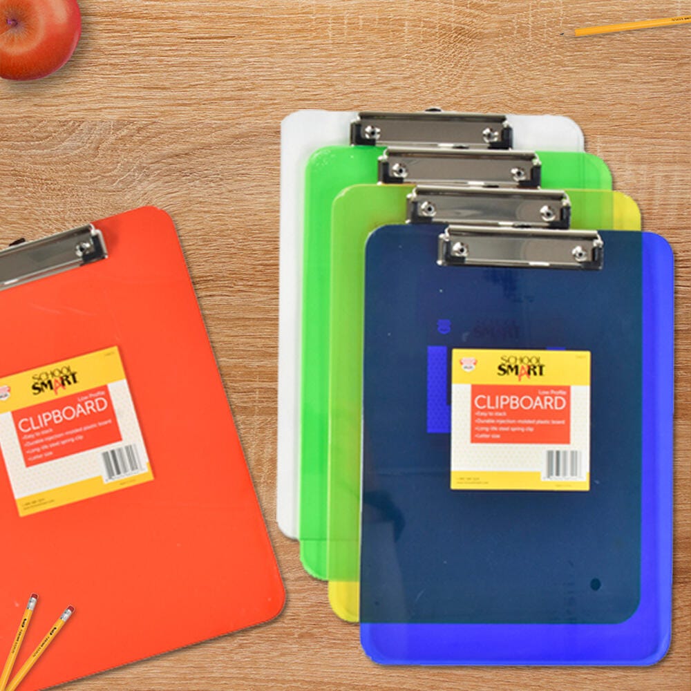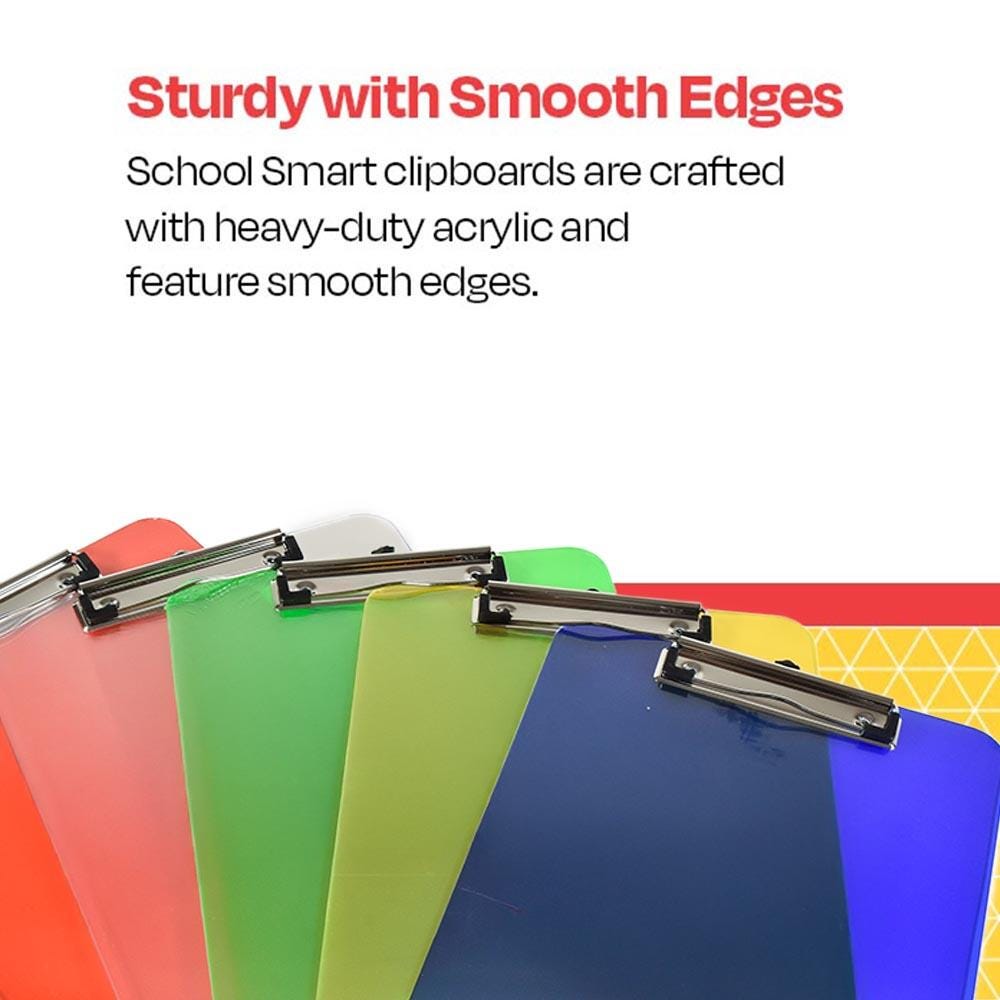The School Smart Low-Profile Clipboard measures 12-3/8 x 8-7/8 x 5/8 inches and is made of translucent plastic with hanging holes for simple storage. This stackable, letter-size acrylic clipboard features a smooth edge for extra safety and is an ideal addition to your office supplies. Colors you may receive include: green, yellow, blue, red, and transparent. Colors may vary as there is no option to choose a color.