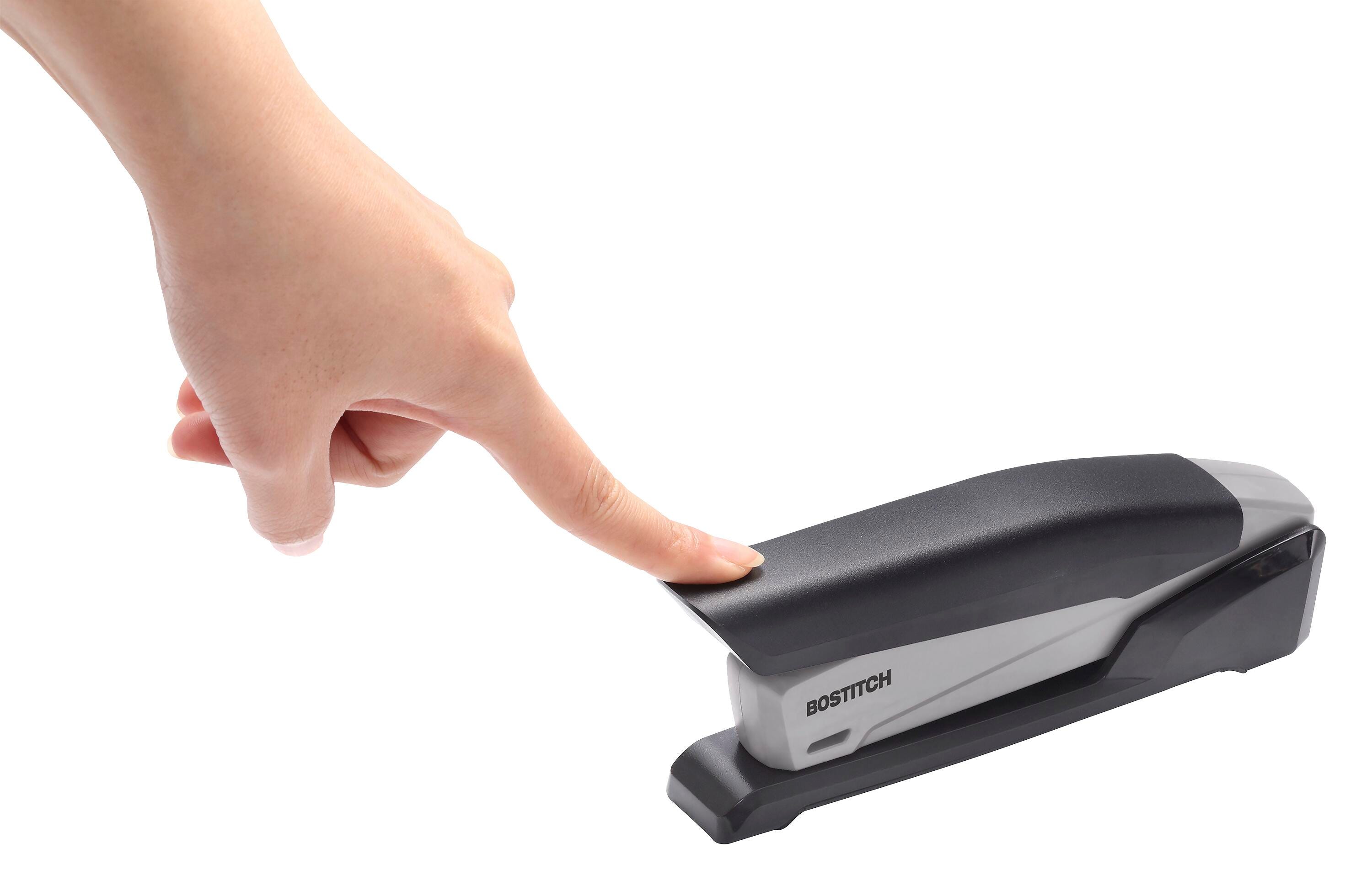 Make stapling 80 percent easier with the PaperPro One-Finger technology of this desktop stapler. Just the push of one finger staples up to 20 sheets. The cleverly built-in staple remover allows quick fixes. Staple storage compartment in the base keeps extra staples on hand for immediate reloading. Jam-free mechanism delivers smooth stapling performance. Sleek, lightweight design with nonslip grip and base allows comfortable handling whether stapling with one finger, a palm or in your hand. Stapler opens for bulletin board tacking. It offers a full-strip (210) staple capacity and uses standard staples. Stapler is made with a percentage of post-consumer recycled plastic. 3-year limited warranty.Features