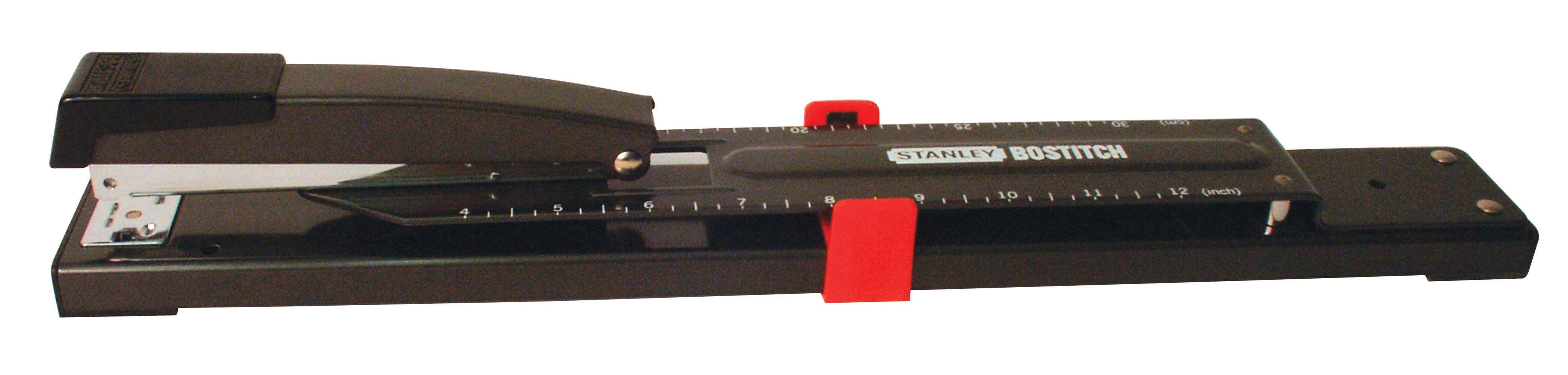 Bostitch Black Long Reach Stapler fastens up to 20 sheets of 20-pound basis weight paper. It features an adjustable paper stop with an easy to read ruler that is calibrated in inches and centimeters. It uses standard staples and staples up to 12 inches from the edge of paper for booklets, pamphlets and brochures. No-Jam technology prevents staple jams. Limited lifetime warranty.