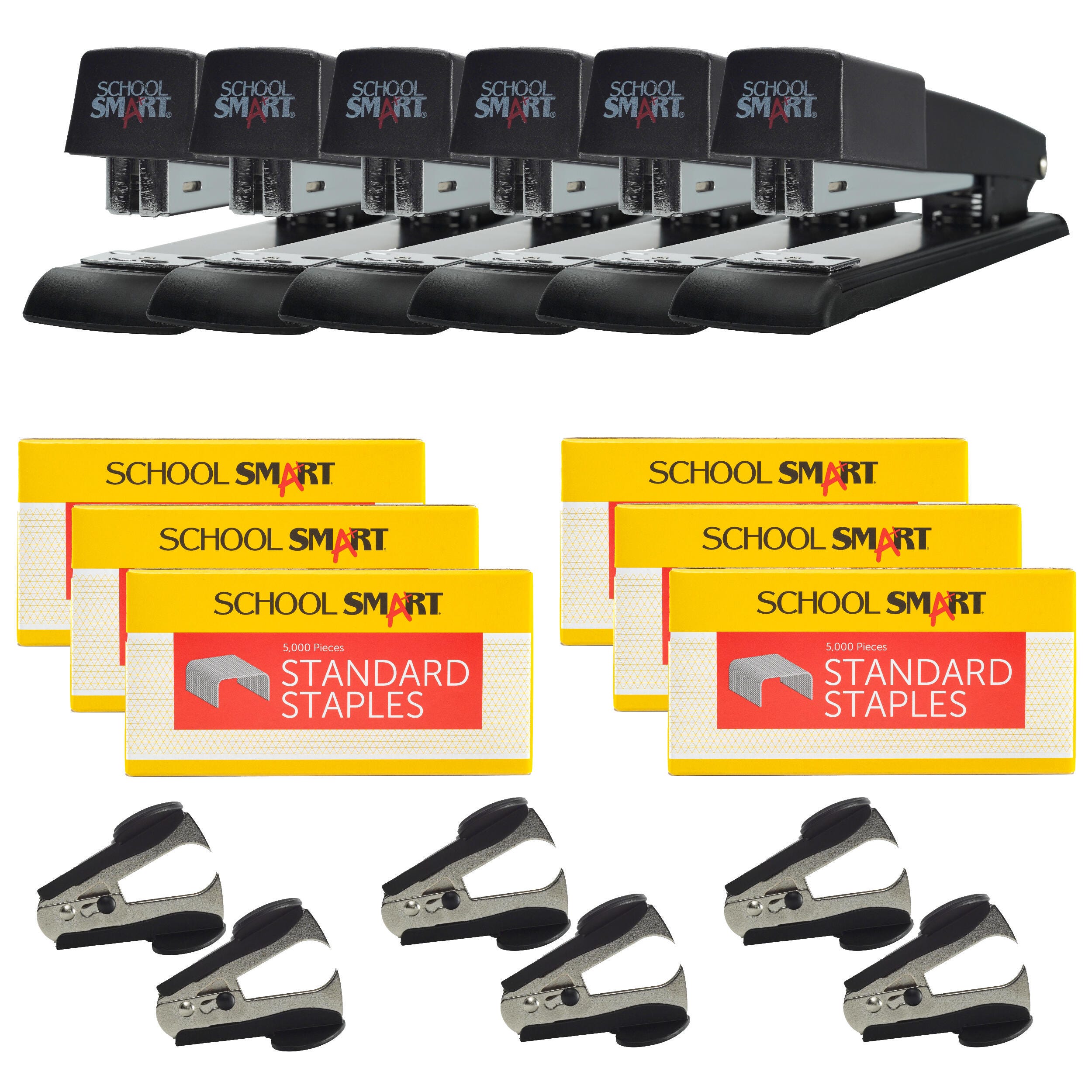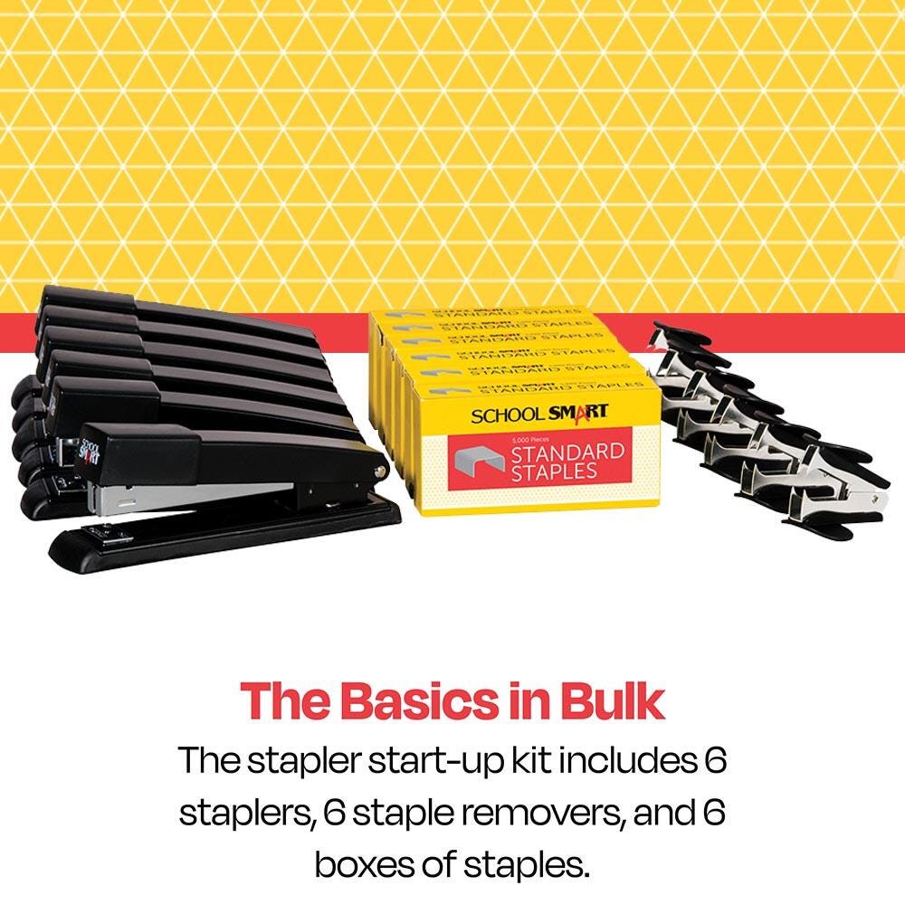 Busy offices and classrooms will love the School Smart stapler value pack. Our affordable and quality starter set includes 6 full strip staplers, 6 boxes of 210 staples, and 6 staple removers. Keep your papers organized and projects looking their best with the staplers start-up set.