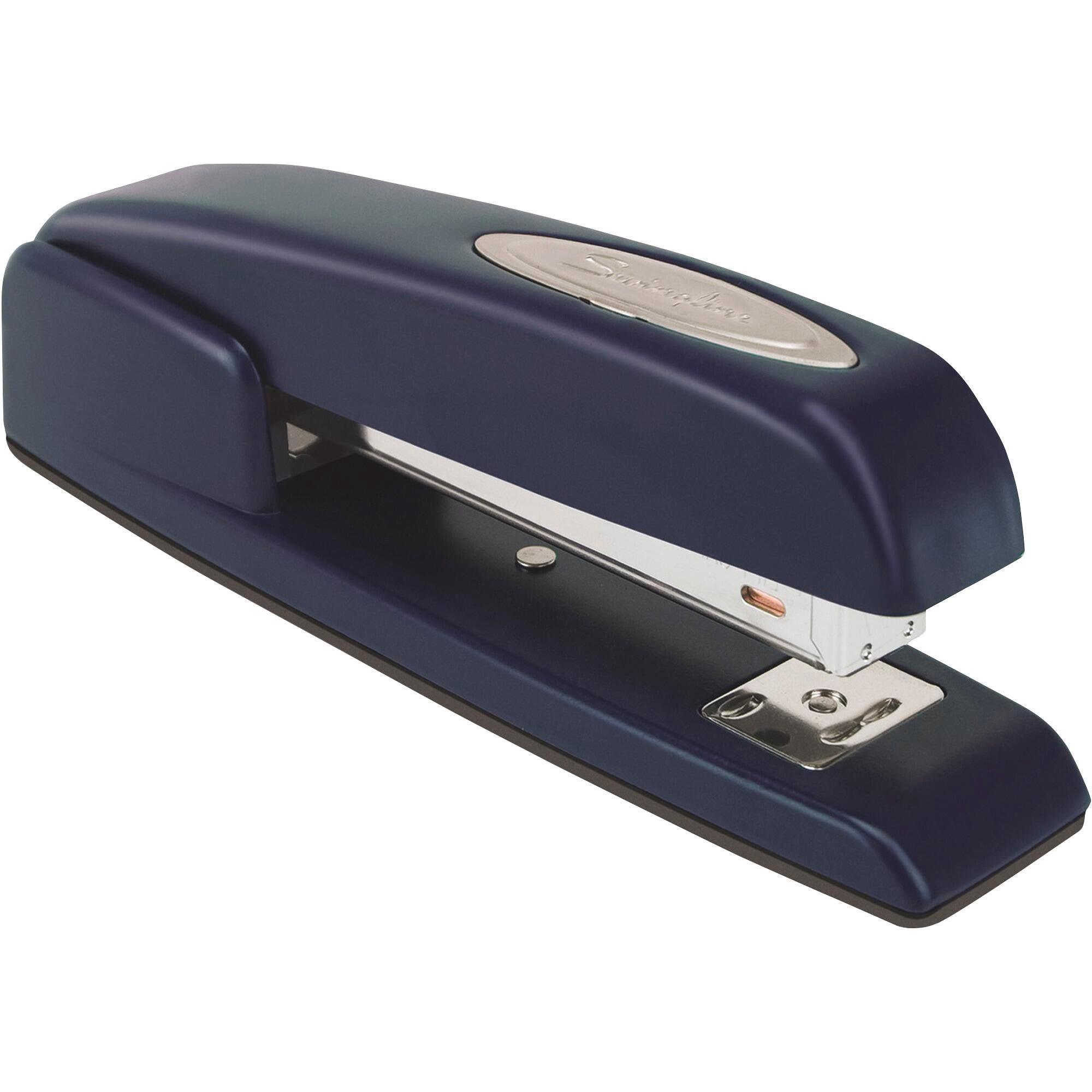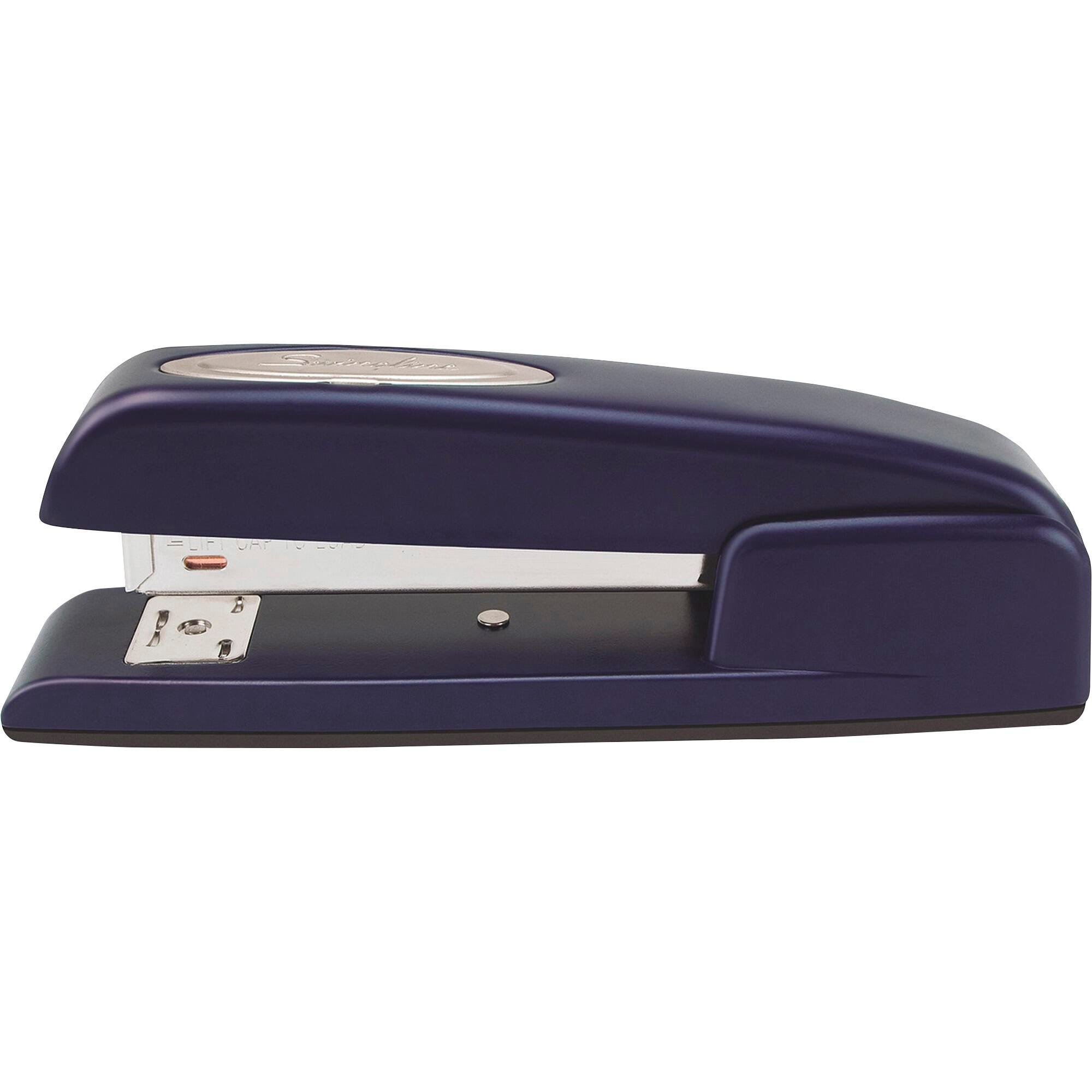 High-quality, durable desktop stapler belongs in every office worker's set of desktop tools. Contemporary, rounded metal stapler fastens up to 25 sheets and opens for tacking flexibility so you can easily tack up flyers and posters. Enhanced for stability, the 747 Business Stapler includes an inner rail that prevents staples from jamming and a positive locking latch to increase precision positioning of each staple. All-metal, die-cast base offers durability and stability. Design also features a contoured cap and padded rubber bottom for comfortable, convenient handheld stapling. Stapler uses Swingline S.F. 4 Premium Staples. Hold up to 210 staples.
