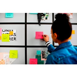 Super sticky notes hold stronger than the original Post-it notes and the adhesive is made with 67% plant-based material by weight. They are ideal for vertical and hard-to-stick surfaces like doors and walls, yet removes and repositions easily. The paper is sourced from certified, renewable and responsibly managed forests and is recyclable. Assorted colors are fuchsia, grape, limeade, turquoise and ultra yellow.