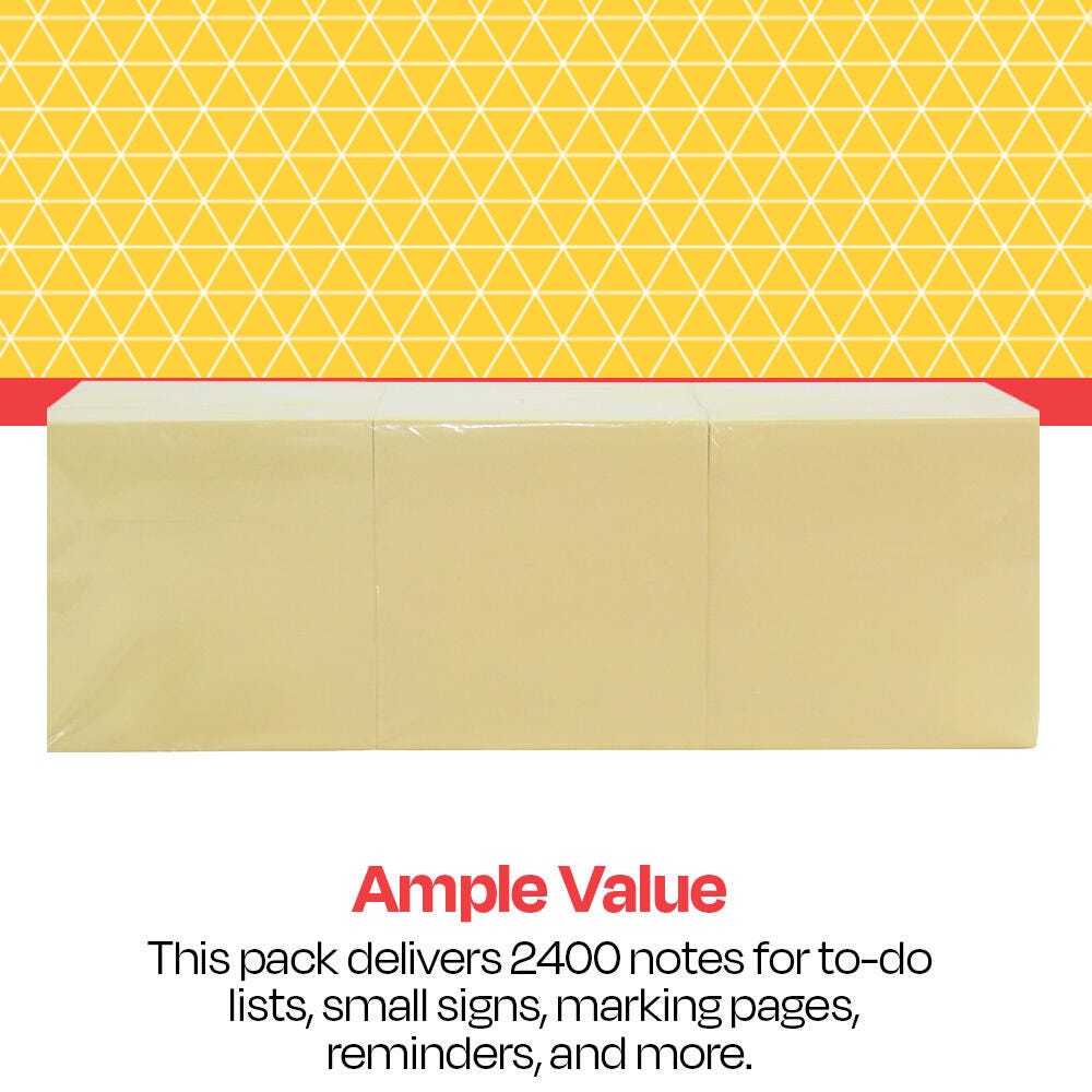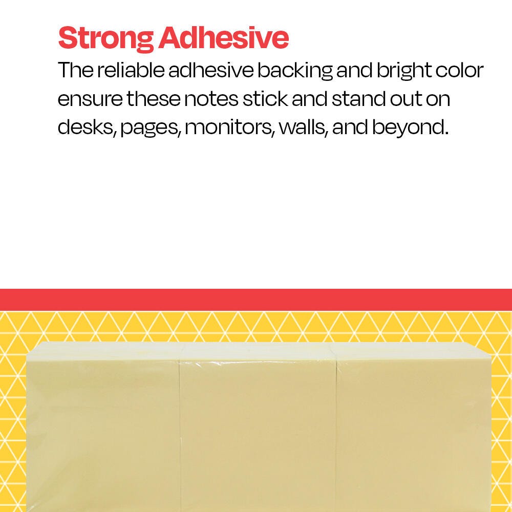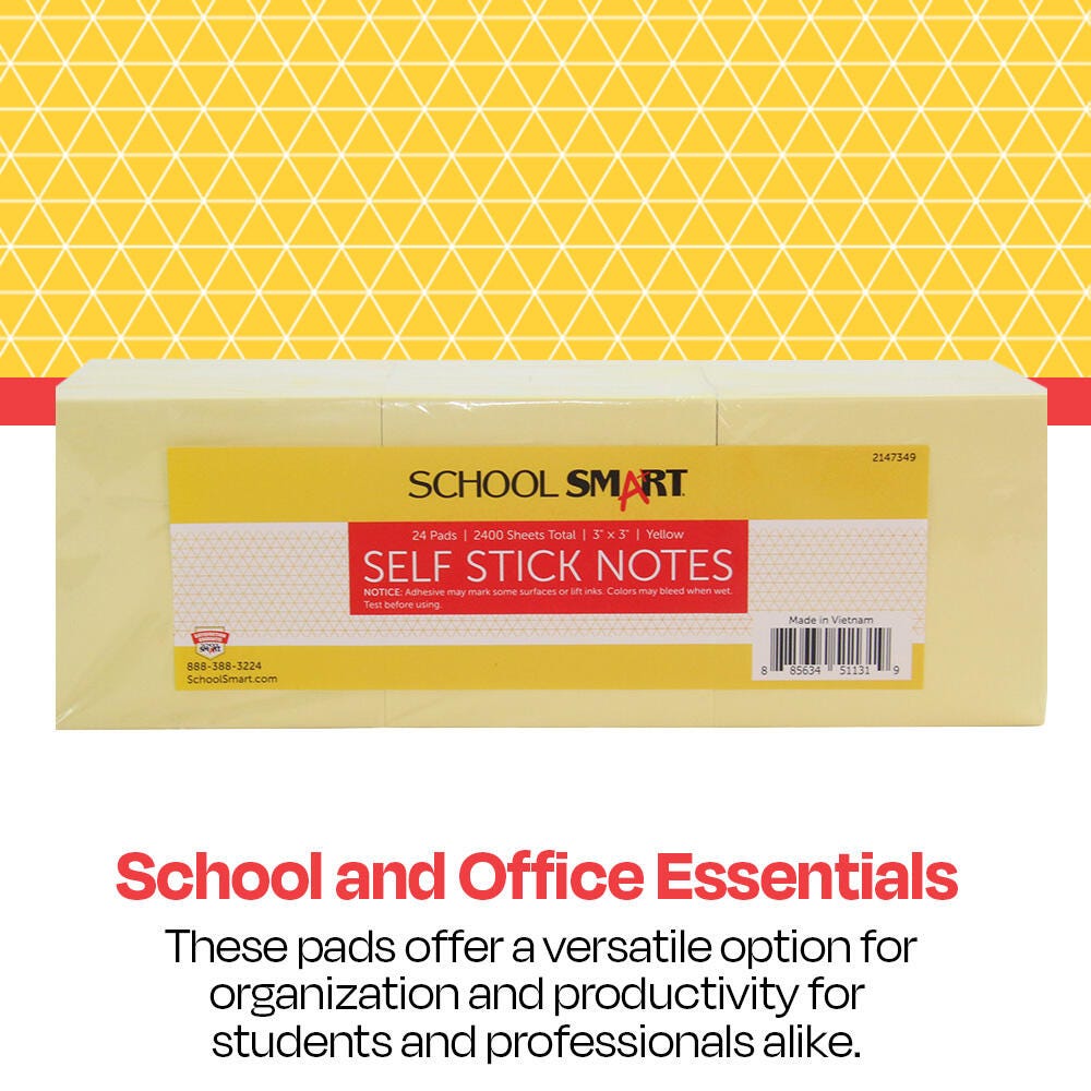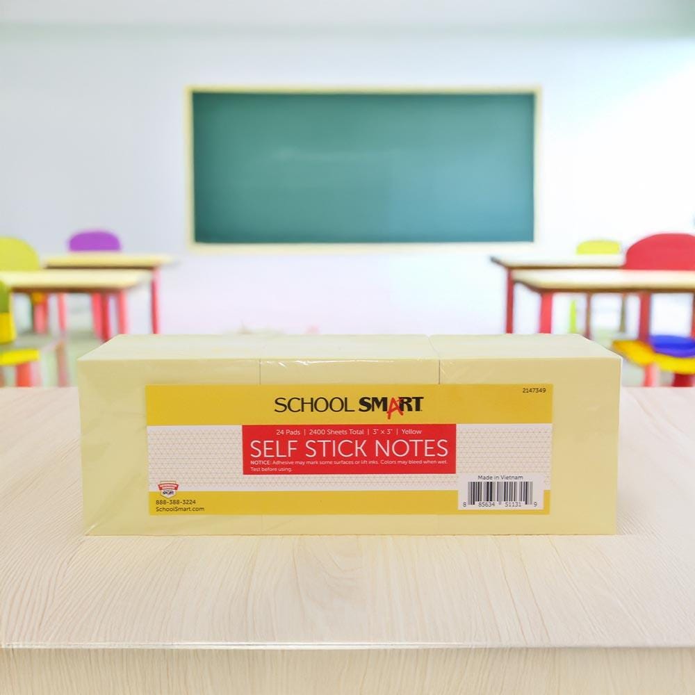 The School Smart Self-Stick Notes are an easy and budget-friendly way to leave messages for friends, coworkers, roommates, or yourself! Each note has a strong, durable adhesive that sticks to most surfaces. The 3 x 3 inch notes provide enough room for quick notes, without taking up too much space on your desktop, planner, or monitor. Suitable for all ages and for any classroom or office! This pack contains 24 pads with 100 yellow sheets each.
