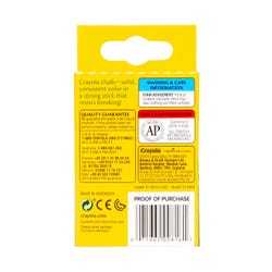 Crayola Multi-Colored Children's Chalk is perfect for creative projects in the classroom! This high-quality chalk draws bright marks for writing and drawing on chalkboards as well as cardboard, construction paper, paper bags, and more. The nontoxic chalk is a great choice for young children or colorful classroom lessons at the chalkboard. The chalk comes in a set of 12 sticks, with 2 sticks each in red, orange, yellow, green, blue, and violet.Features