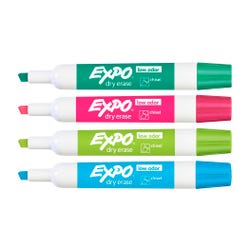 This set from EXPO includes markers with a versatile chisel tip that allows for broad, medium, and fine lines and markings. They each use specially formulated ink that has virtually no odor, erases easily from most nonporous surfaces, and is bold enough to see from a distance. These EXPO markers are ideal for whiteboard projects like presentations, schedules, displays, and more in the classroom, office, or home. This set of 4 contains the colors lime, amethyst, aquamarine, and pink.Features