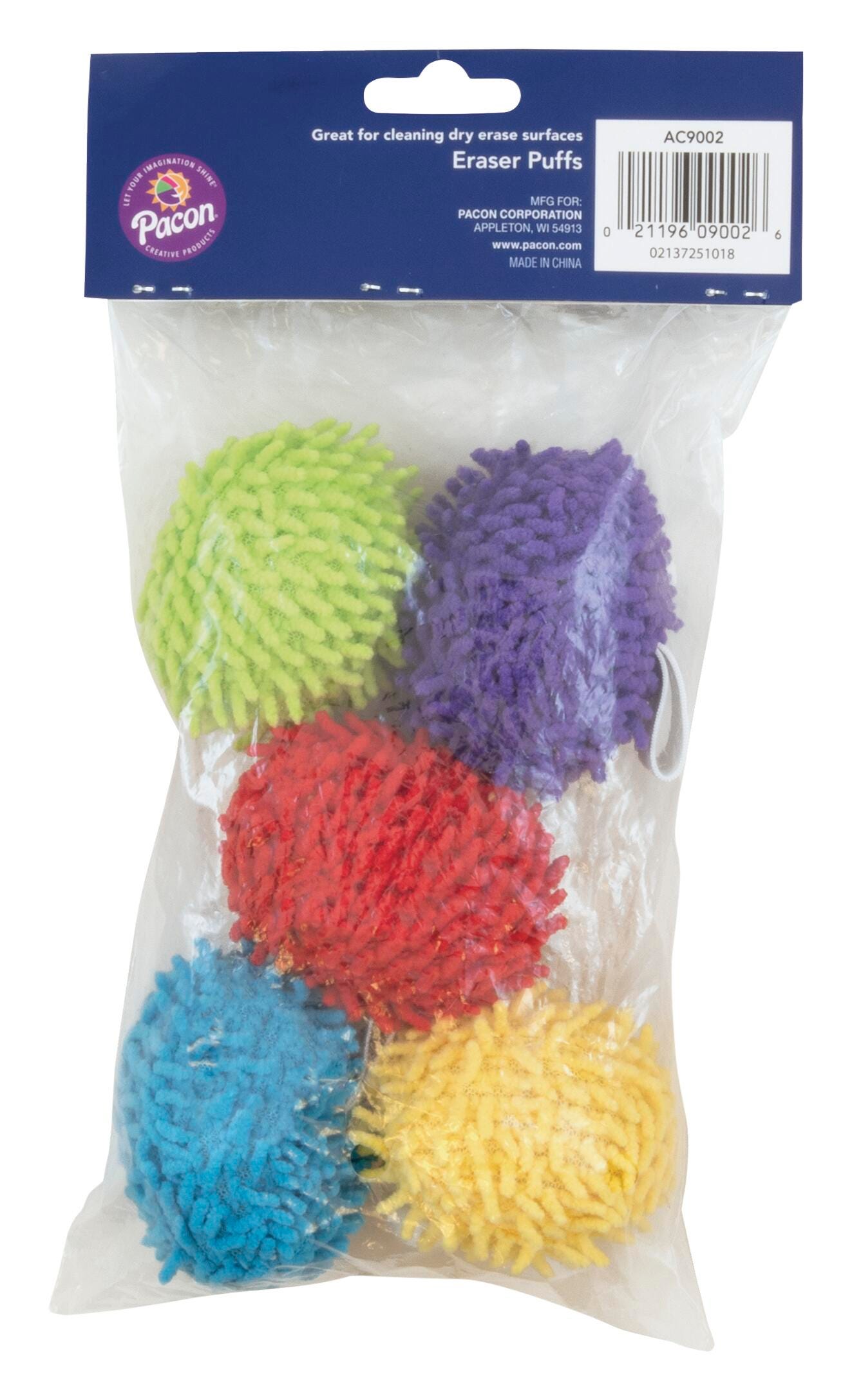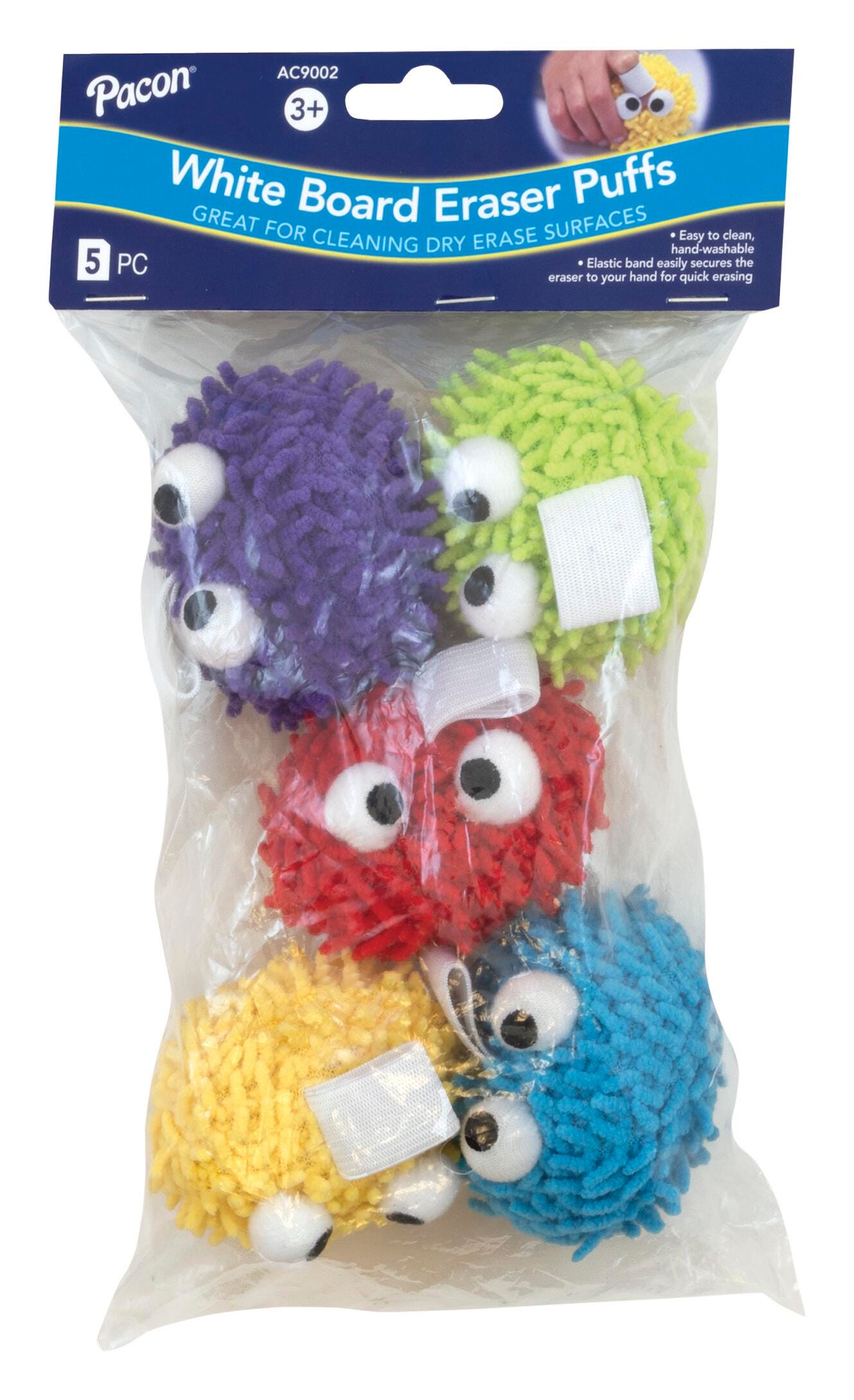 Microfiber material for easy and through dry erase surface cleaning. Elastic band makes it easy to secure the eraser to your hand for quick erasing. Package contains 5 Eraser Puffs in 5 assorted colors: Red, Yellow, Green, Blue, and Purple. Erasers are easy to clean in between uses. Ages 3 and up.