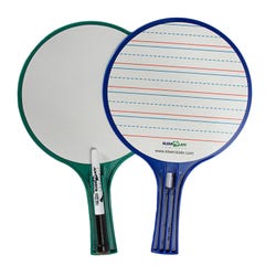 Round dry erase boards are two sided, one side has a blank dry erase surface, and the opposite has a lined dry erase surface. Each board has a 7 x 7 inch writing surface. Includes 12 small black dry erase markers and erasers with 48 hr CAP-OFF technology and a 4 pack of large dry erase markers for the teacher. Markers conform to CPSIA and ASTM D-4236 standards and fit in the handle of the dry erase paddle for easy storage and are certified non-toxic and low odor. They are made of durable, long lasting plastic that holds up to frequent use and can be washed in the sink. Also includes 12 x 12 inch microfiber cleaning cloth which is washable and reusable.Features