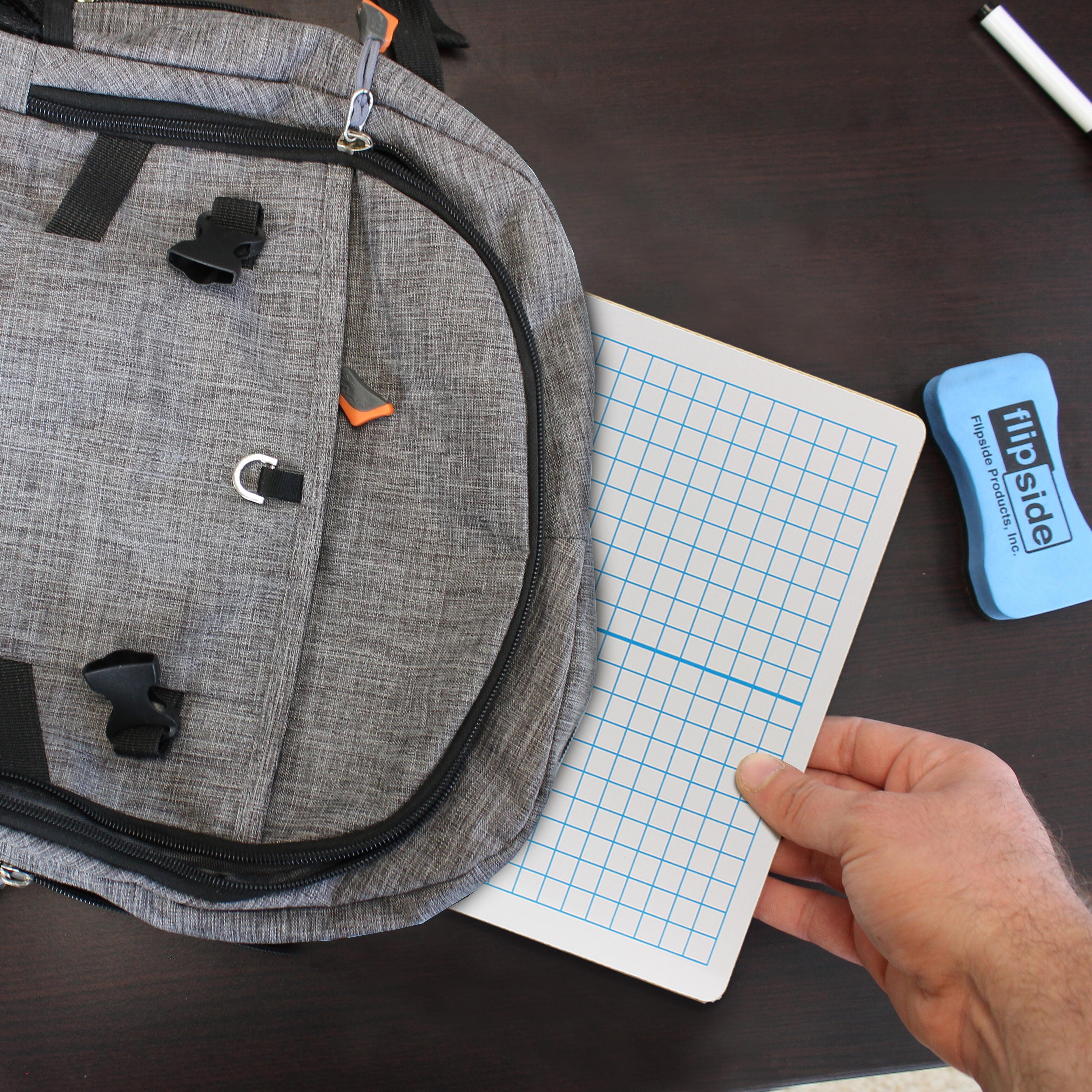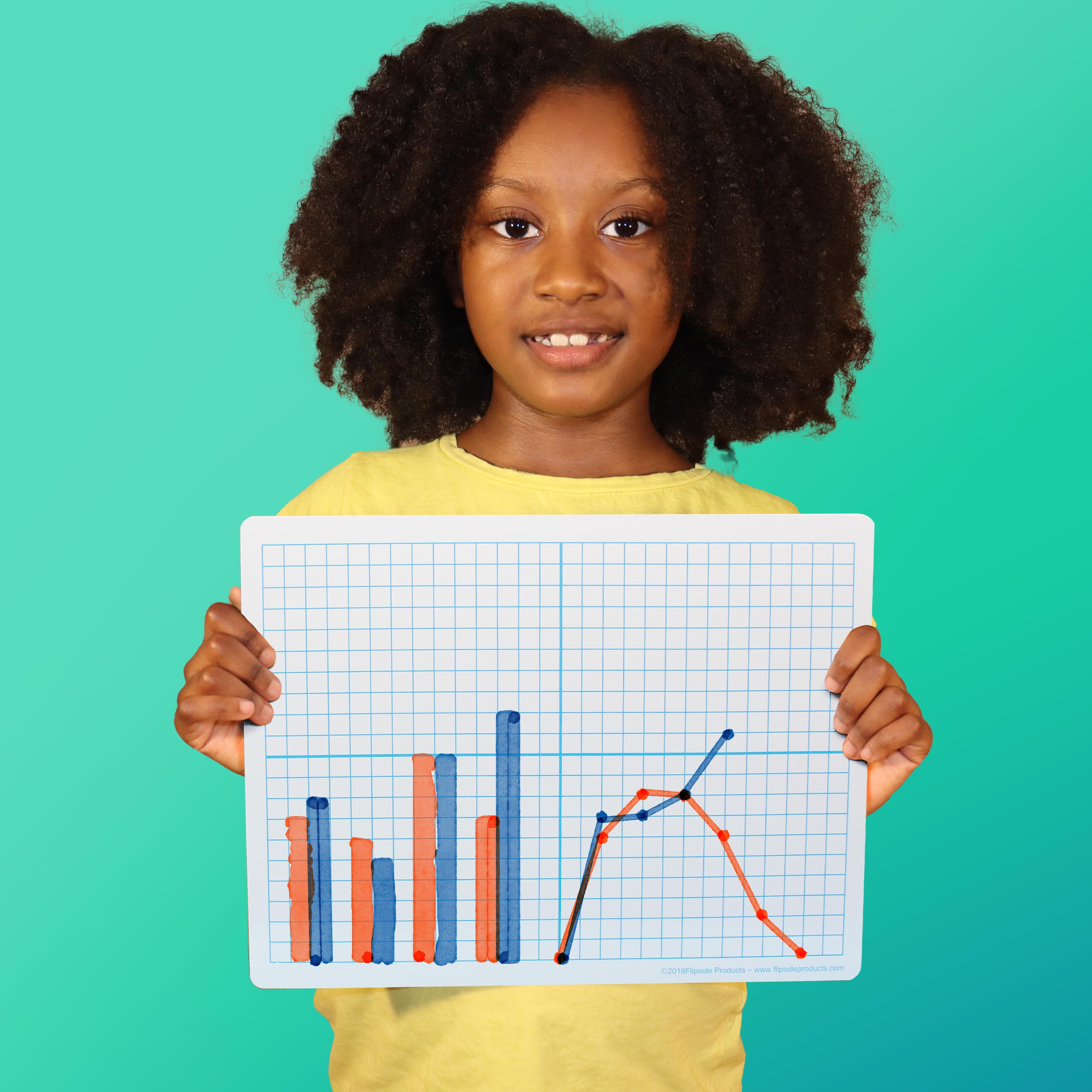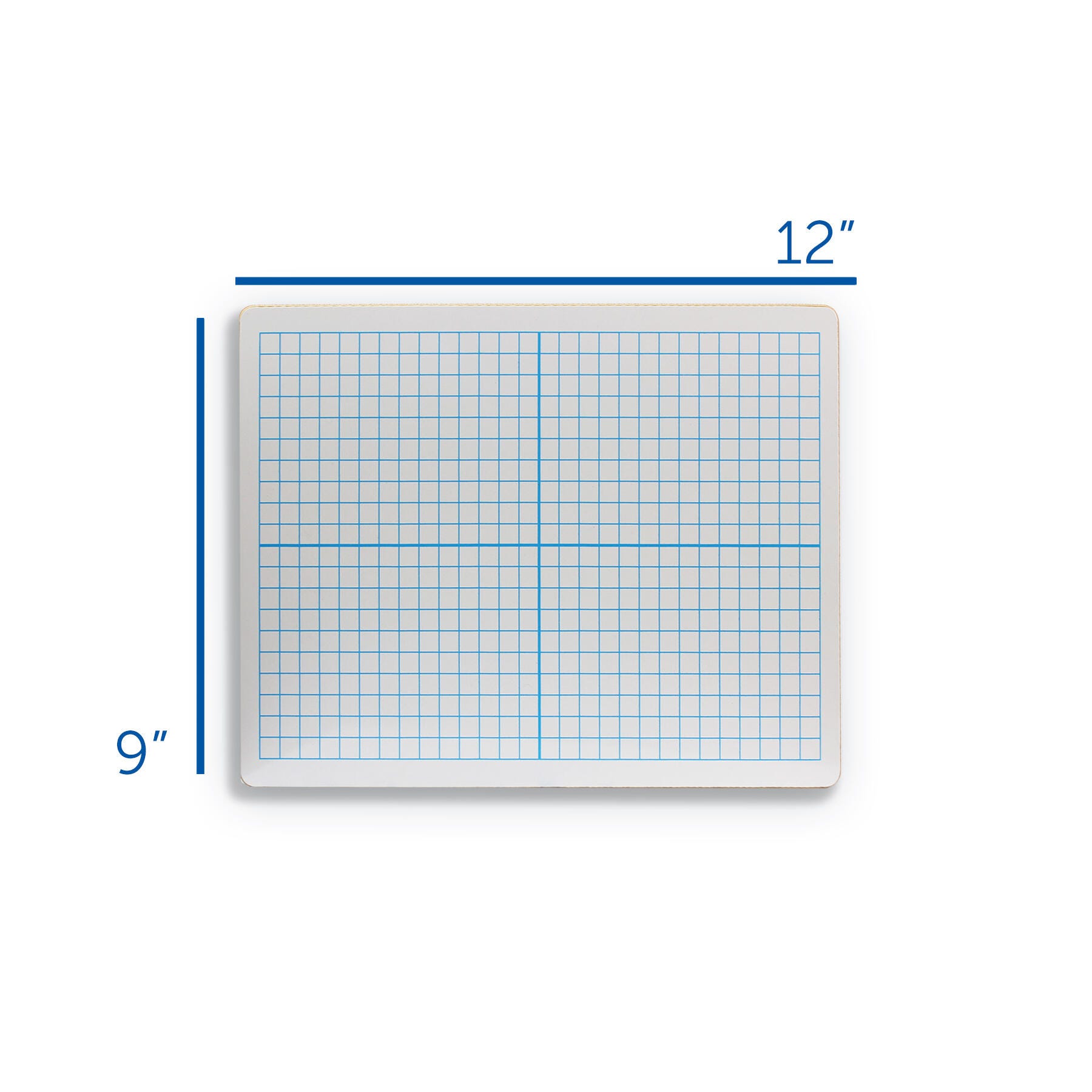 Economical, unframed lap board features a blue XY axis dry erase grid on one side and plain dry erase on the other. Bold lines separate board into quadrants each 14 squares by 10 squares; total grid is 28 squares by 20 squares. Individual squares measure 3/8-inches. Boards have a non-ghosting dry erase surface with rounded corners and smooth edges for comfort and safety. Durable hardboard backing is warp and chip resistant. Measures 9 x 12 x 1/8 inches.
