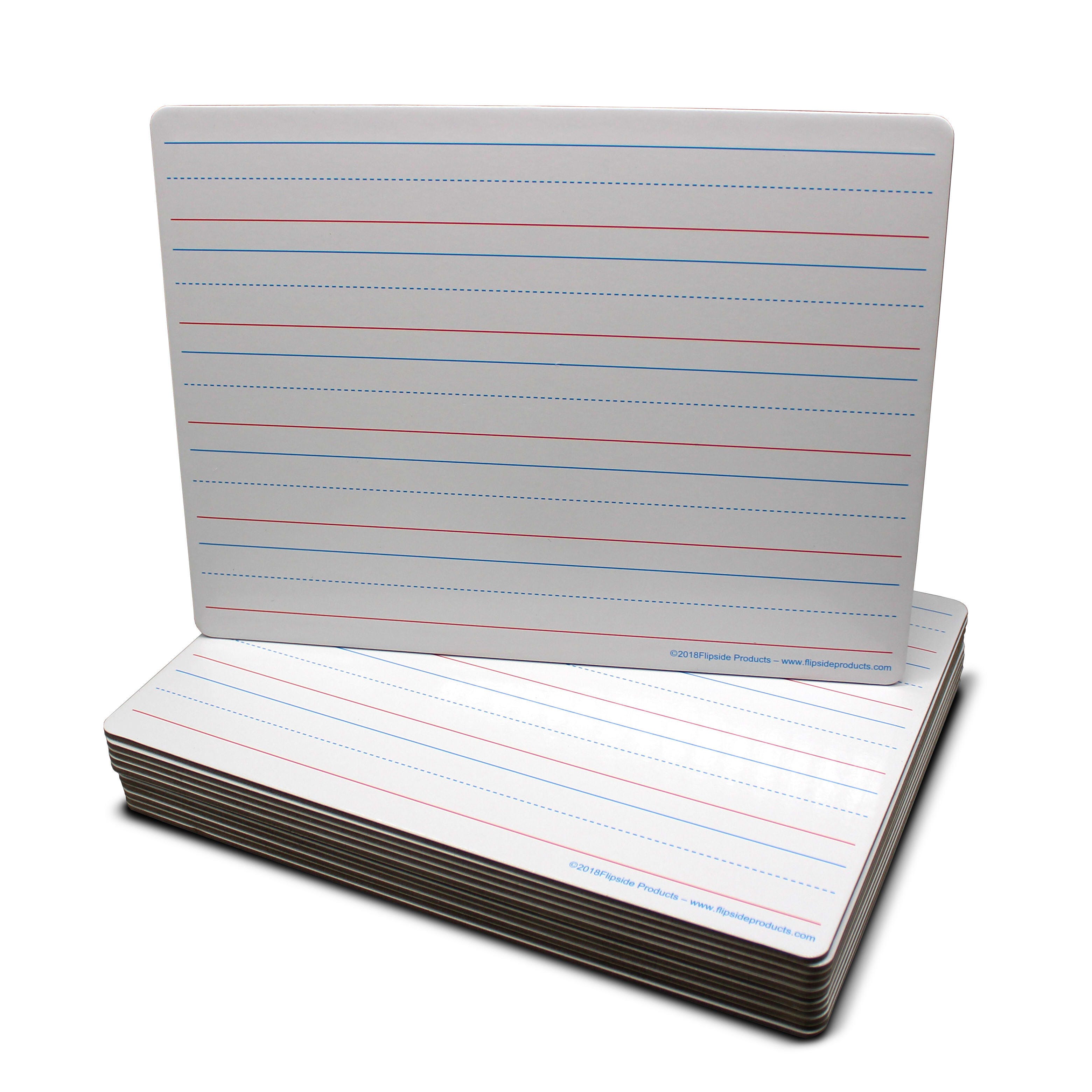 Ideal for teaching and early learning, bright white board contains 5 sets of blue headline and broken mid-line plus red baseline format. Each line set measures 1-1/8 inches with 3/8 inches of blank descender space between sets. Back side is magnetic plain white dry erase. Boards feature a non-ghosting dry erase surface with rounded corners and smooth edges for comfort and safety. Backing is warp and chip resistant. Measures 12 x 9 x 1/8 inches.