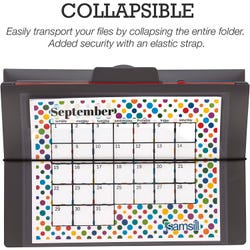 This customizable hanging file organizer is perfect for on the go. It is collapsible with an outer elastic band to ensure everything stays in place. Features a built-in handle for hanging and a customizable front cover, which is perfect for a monthly calendar or school papers. Each individual folder is removable, making it easy to take one subject out when needed.Includes: