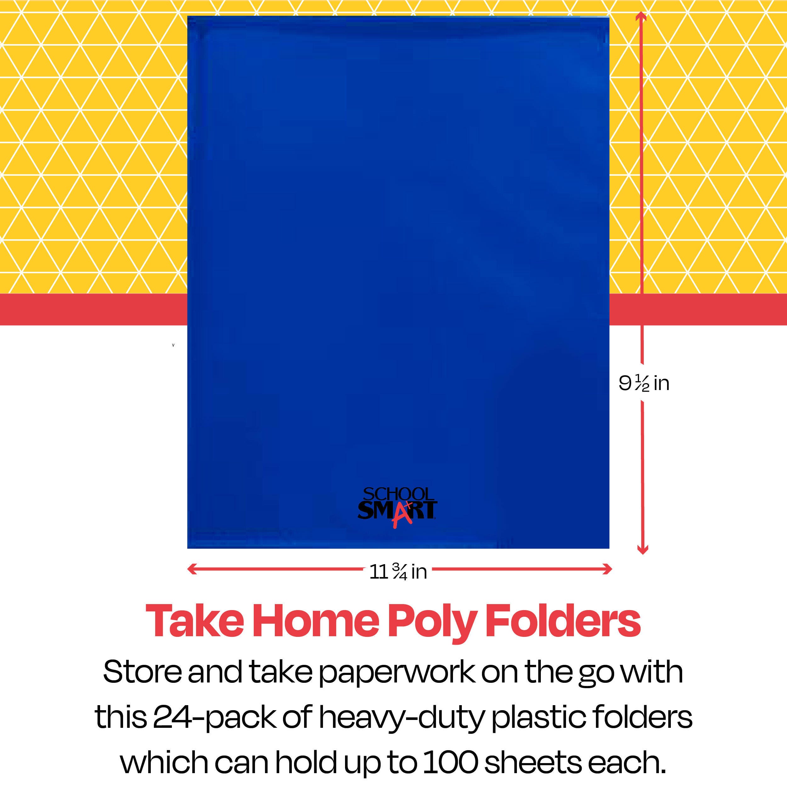 School Smart blue take home folders provide maximum protection and a fun, sleek appearance. The construction is made of durable grained polypropylene with an embossed, clear border for viewing and placing your most important documents or notecards. Our 2-pocket folders with clear border slips include a left pocket with business card holder slot and "Return to School" bilingual text indications. Each plastic take home folder for students holds up to 100 sheets of paper.
