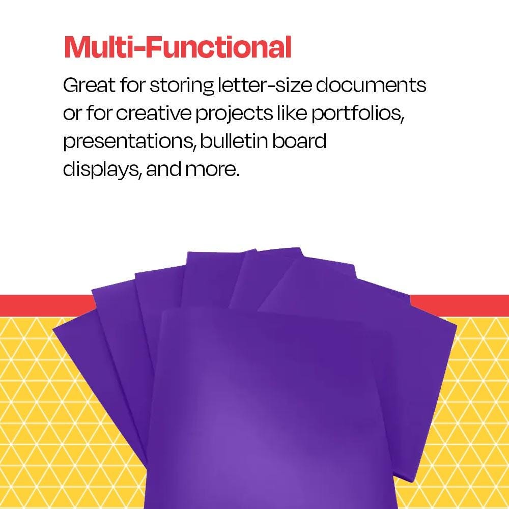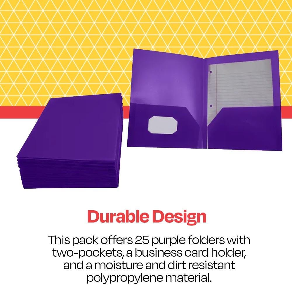 Store and protect your documents in sleek purple poly folders by School Smart; this set includes 25 portfolios.