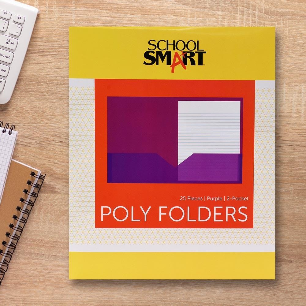 Compile and file with ease with School Smart 2-pocket poly folders with no brads or fasteners. The plain purple plastic folders keep letter-size papers straight, neat, and accessible. Flexible and lightweight (yet built to last), each portfolio is made of durable polypropylene that resists moisture and dirt. The left interior pocket includes a business card slot for labeling or presentations. Use the 2-pocket heavy duty poly portfolio for business or personal use to organize documents, assignments, presentations, and notes.Features