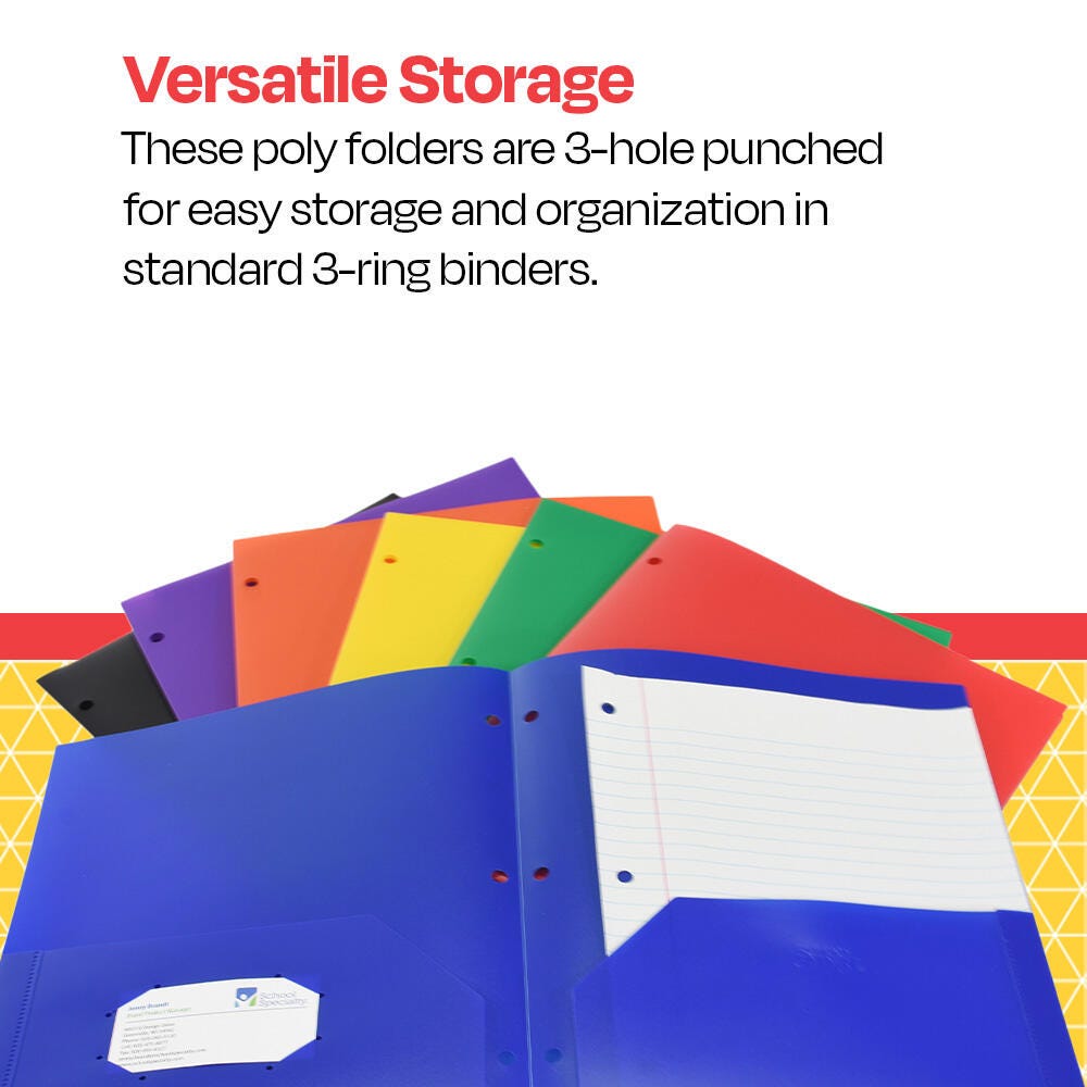 School Smart 2-Pocket Poly Folders, Letter Size, 3-Hole Punched, Assorted Colors, Set of 36