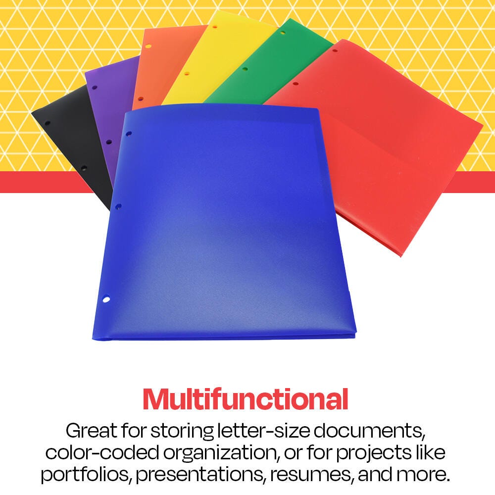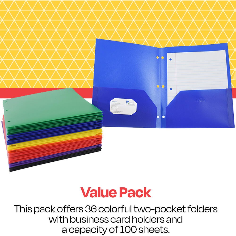 Organize and store important documents in the classroom, office, or home with School Smart's 2-Pocket Folders. These flexible and lightweight folders are made of durable polypropylene that resists moisture and dirt. Each folder has a business card slot on the left interior pocket and is hole-punched to easily fit into standard three-ring binders for additional organization. The folders are designed to hold letter-size, 8-1/2 x 11-inch sheets. This pack contains 36 folders in an assortment of blue, red, green, yellow, orange, purple, and black.