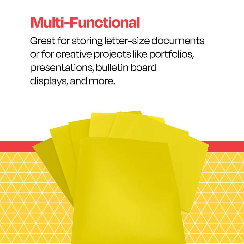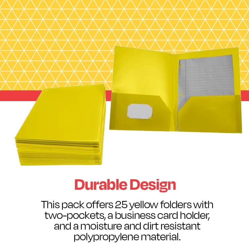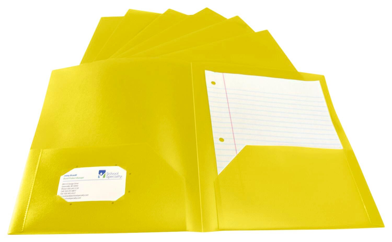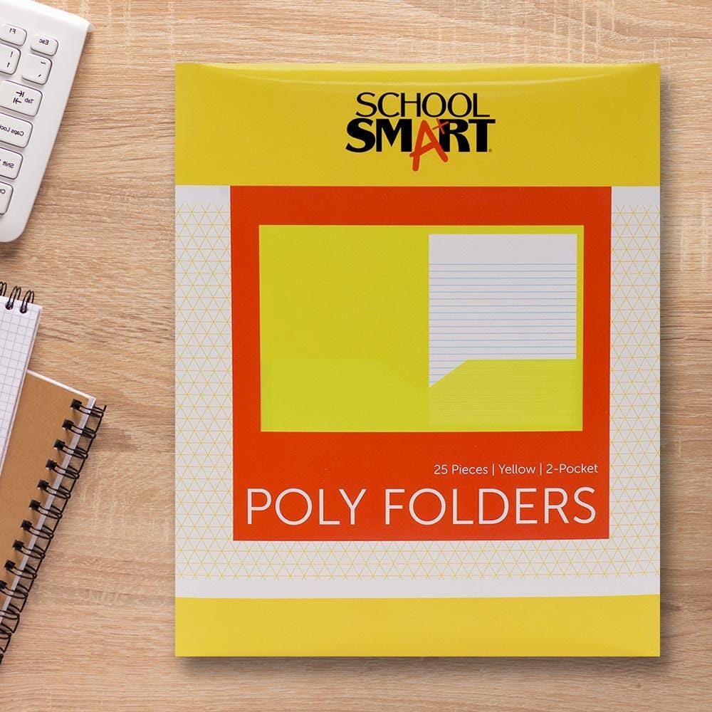 Compile and file with ease with School Smart 2-pocket poly folders with no brads or fasteners. The plain yellow plastic folders keep letter-size papers straight, neat, and accessible. Flexible and lightweight (yet built to last), each portfolio is made of durable polypropylene that resists moisture and dirt. The left interior pocket includes a business card slot for labeling or presentations. Use the 2-pocket heavy duty poly portfolio for business or personal use to organize documents, assignments, presentations, and notes.