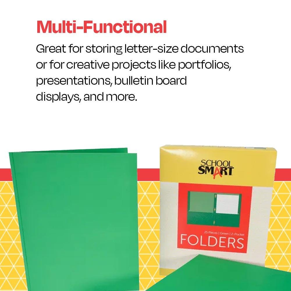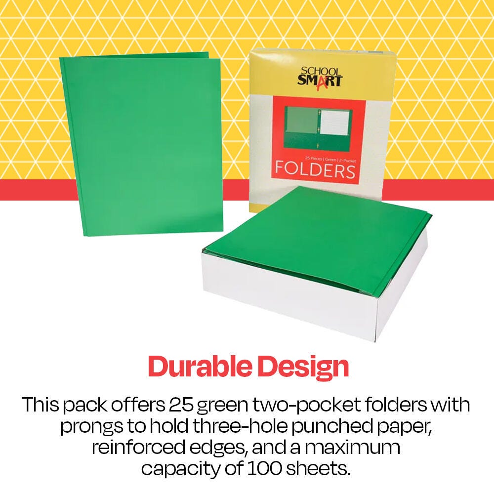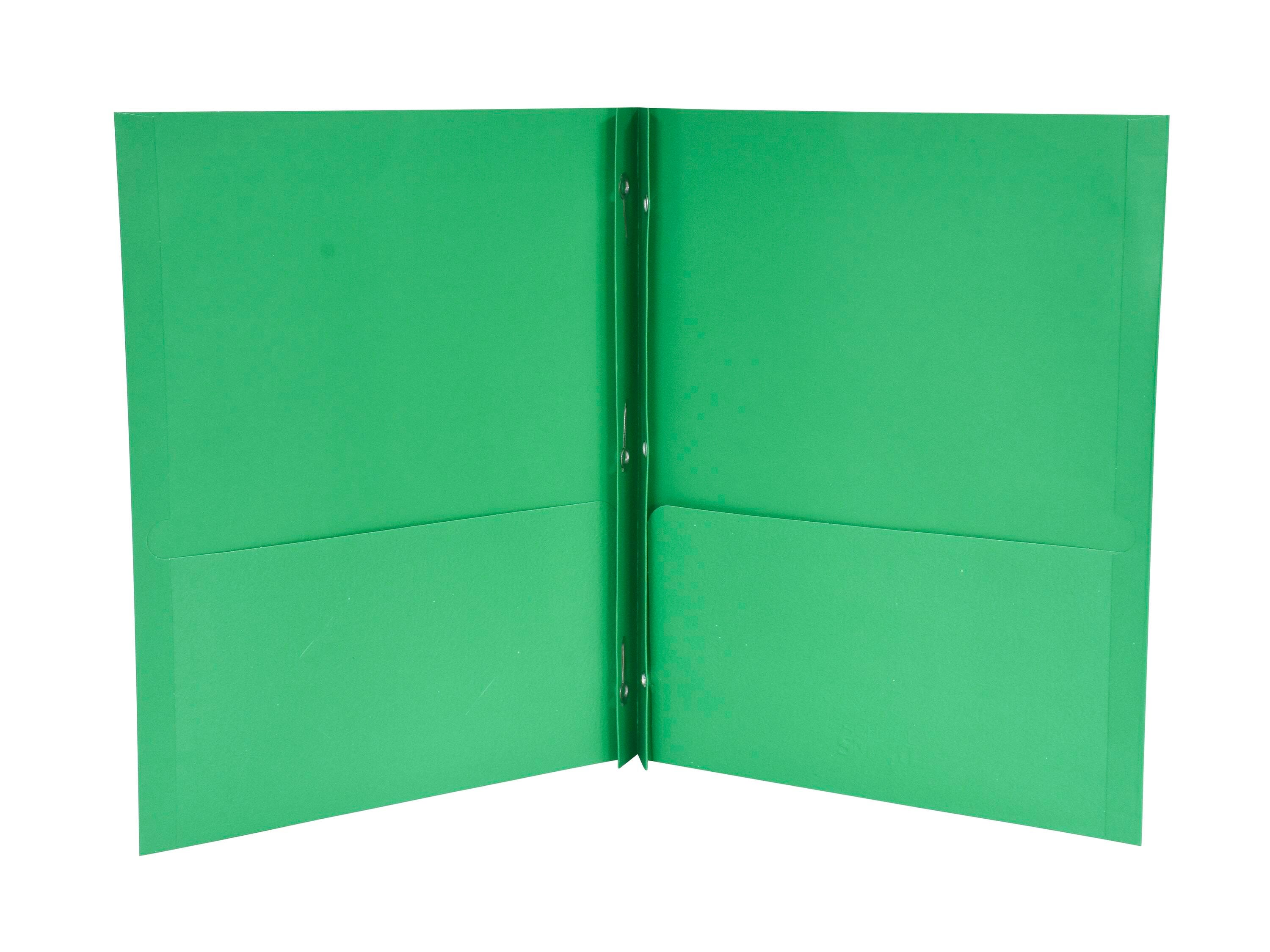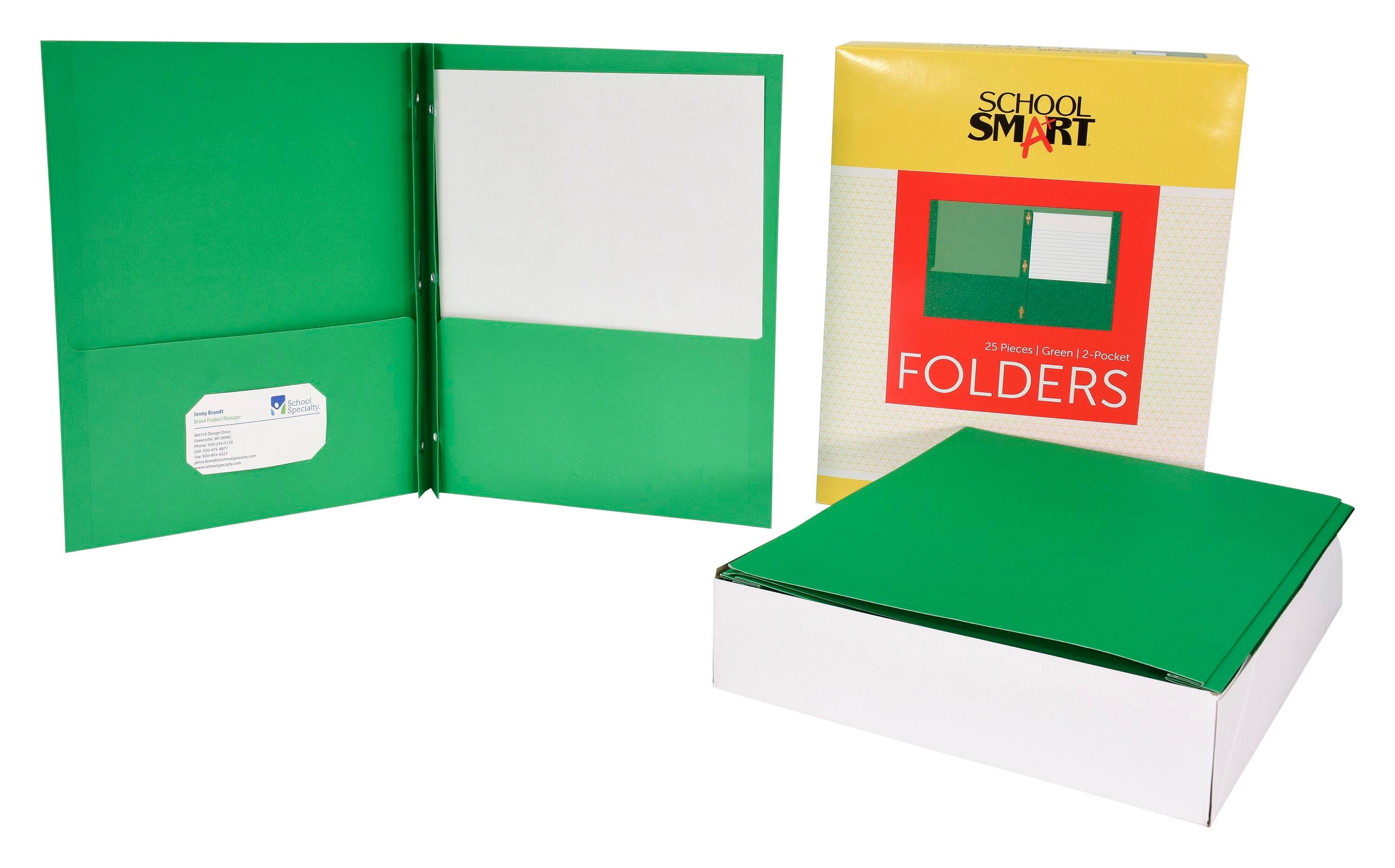 This set of School Smart 2-pocket folders with fasteners comes in a classic green color. Each twin pocket file portfolio holds 8-1/2 x 11 inch sheets. An expandable gusset insert with three fasteners fits standard 3-hole punched sheets for extra storage. The pocket folder with prongs can be used for daily storage, protection for important documents, or as a report cover for school. An embossed finish with double reinforced edges provides extra durability.