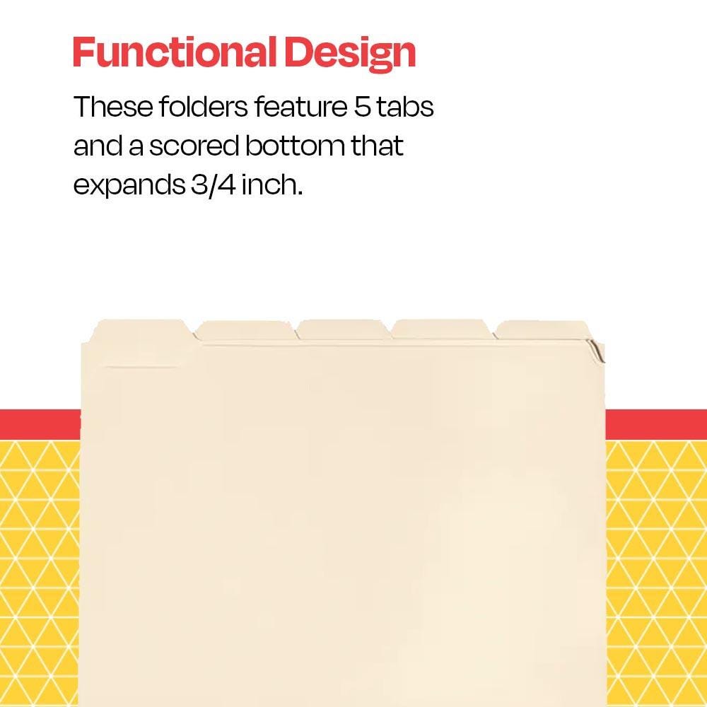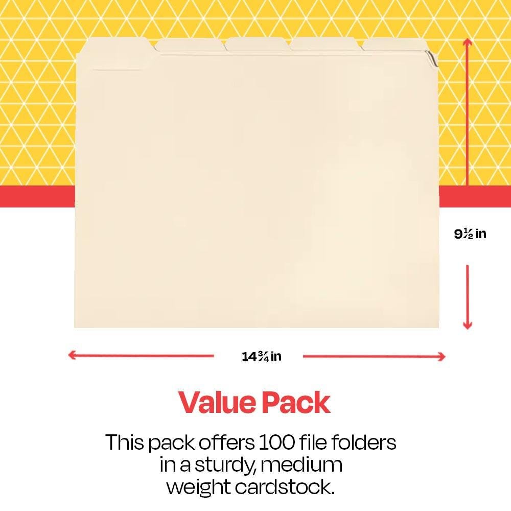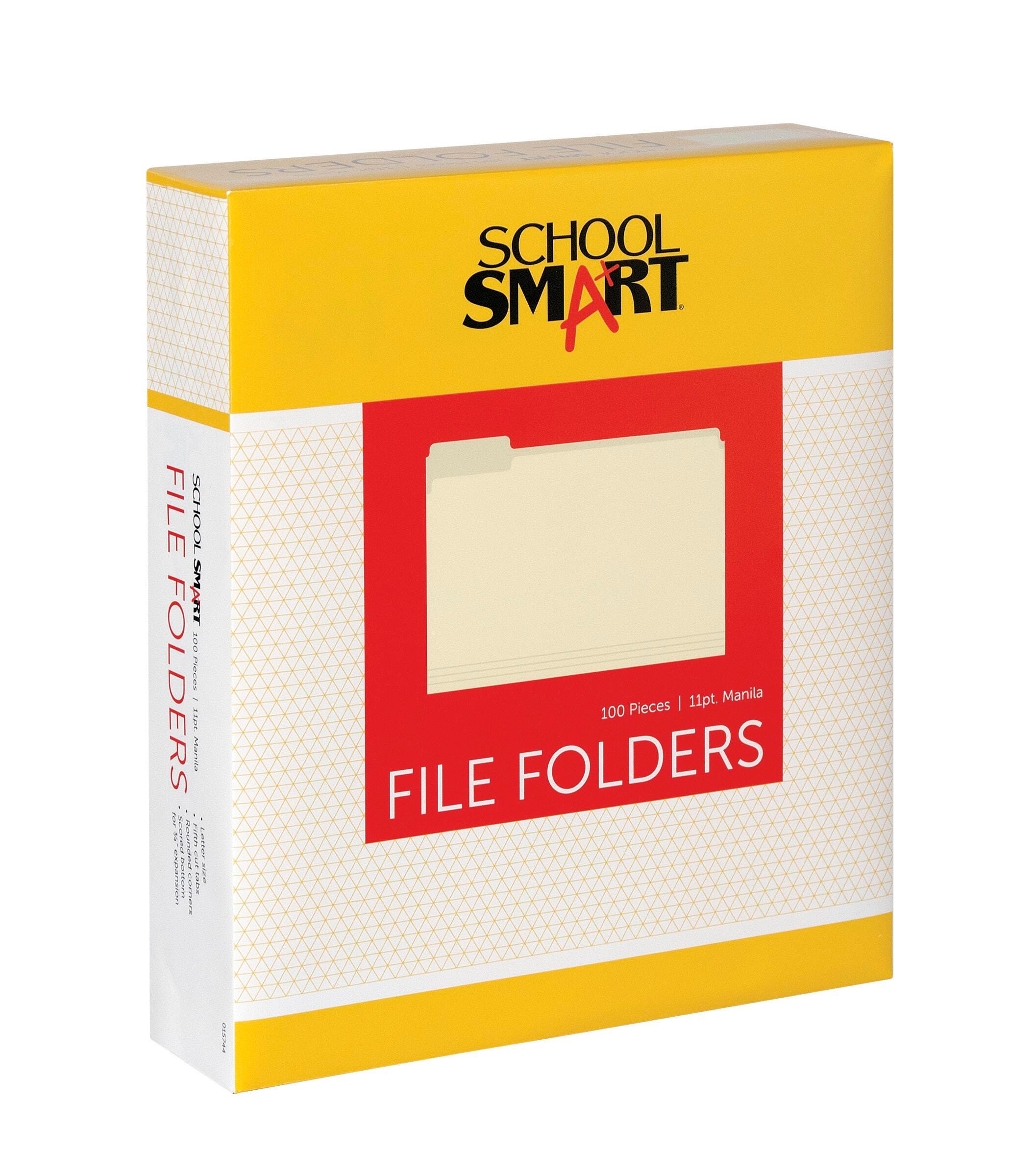 This School Smart 100-pack of manila file folders comes in a letter size. Use the top tab filing folders for personal or professional needs. Each letter size folder measures 9-1/2 x 11-3/4 inches and is made of smooth finish, medium weight manila. The 5 tabs allow for easy labeling and sorting.